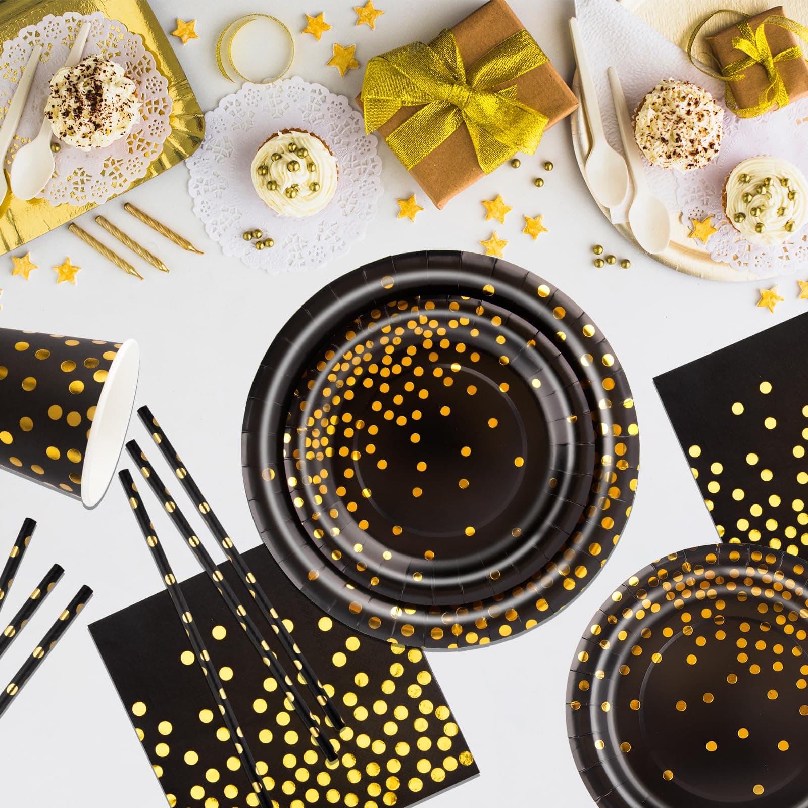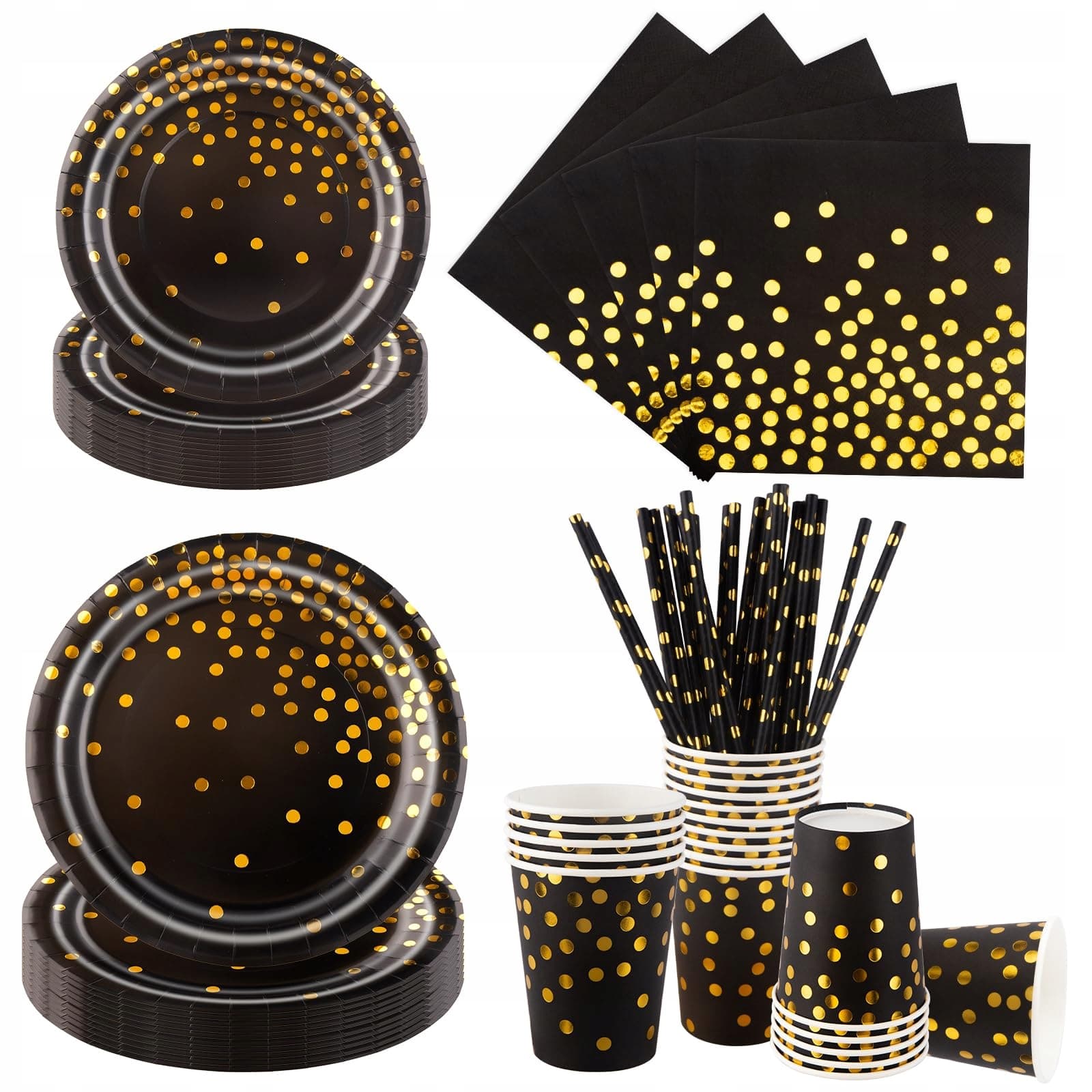 Aitsite Zestaw 100 sztuk talerzy papierowych, czarno-złote talerze imprezowe jednorazowe z talerzami, serwetkami, słomkami i kubkami na urodziny, wesela, rocznice