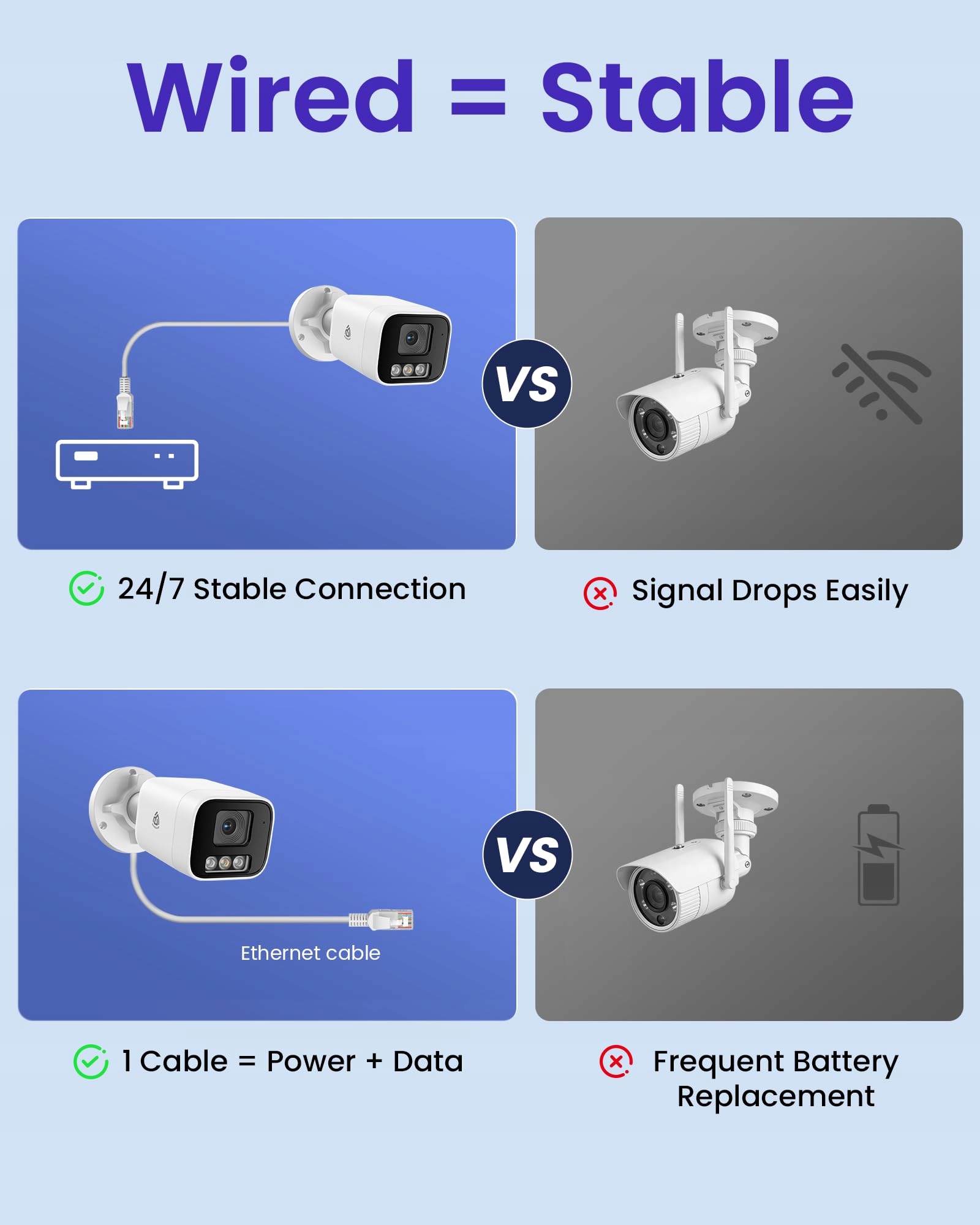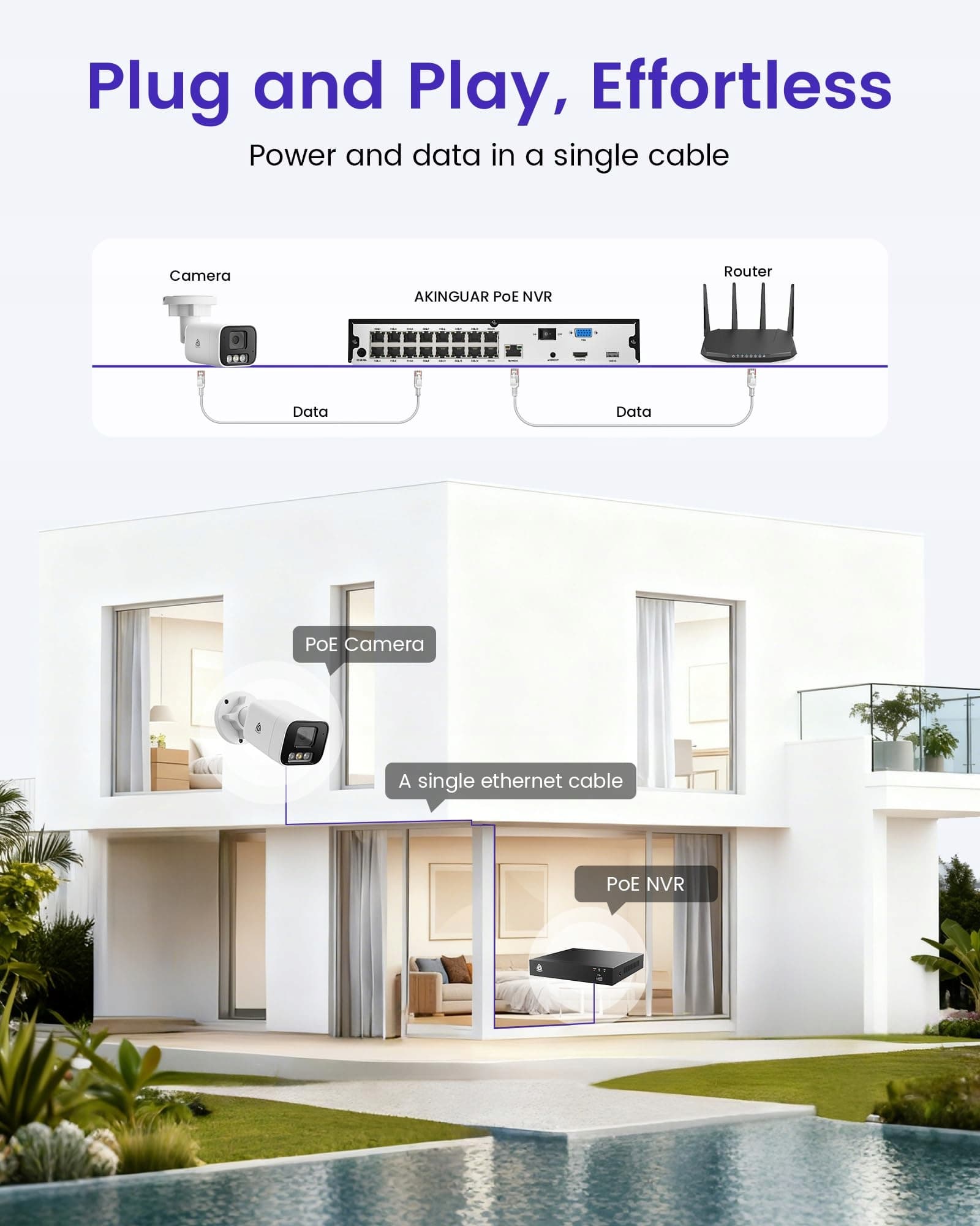 【Prosta instalacja PoE Plug&Play】Technologia Power over Ethernet (PoE): tylko 1 kabel na kamerę do zasilania i danych. Plug & Play w kilka minut, automatyczne wykrywanie kamer po podłączeniu do NVR. Bez dodatkowych adapterów, bez elektryka – idealne do samodzielnego montażu systemu monitoringu.