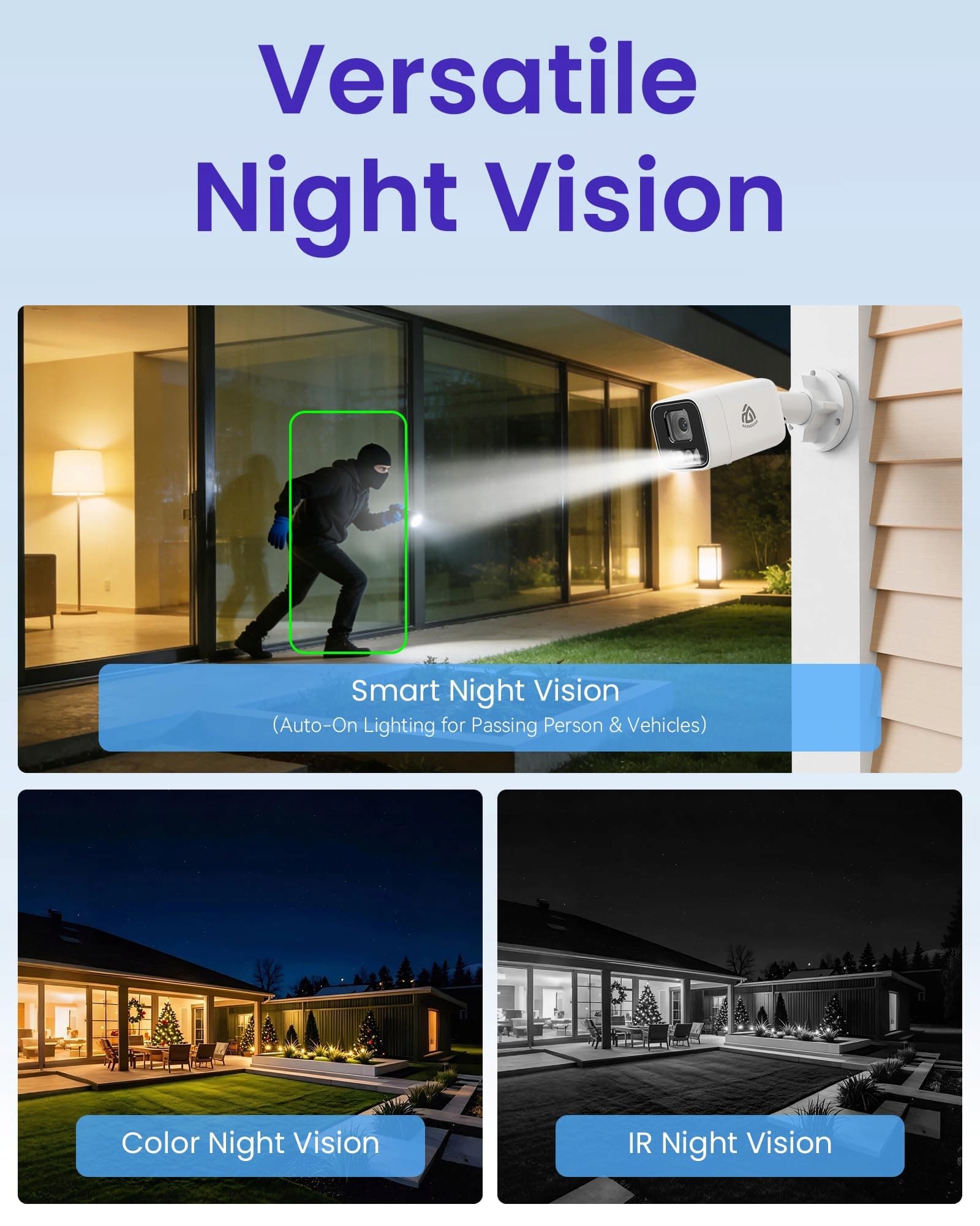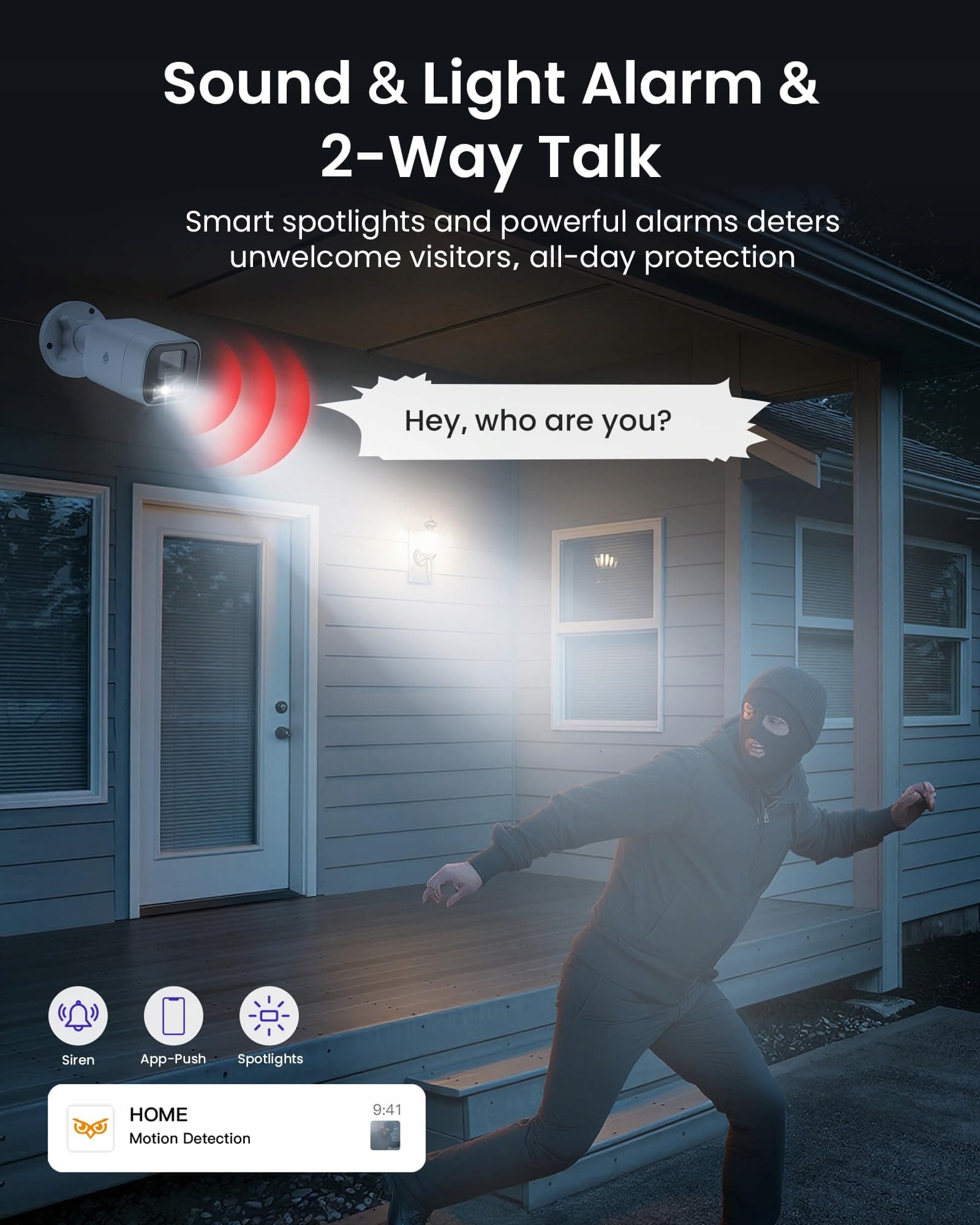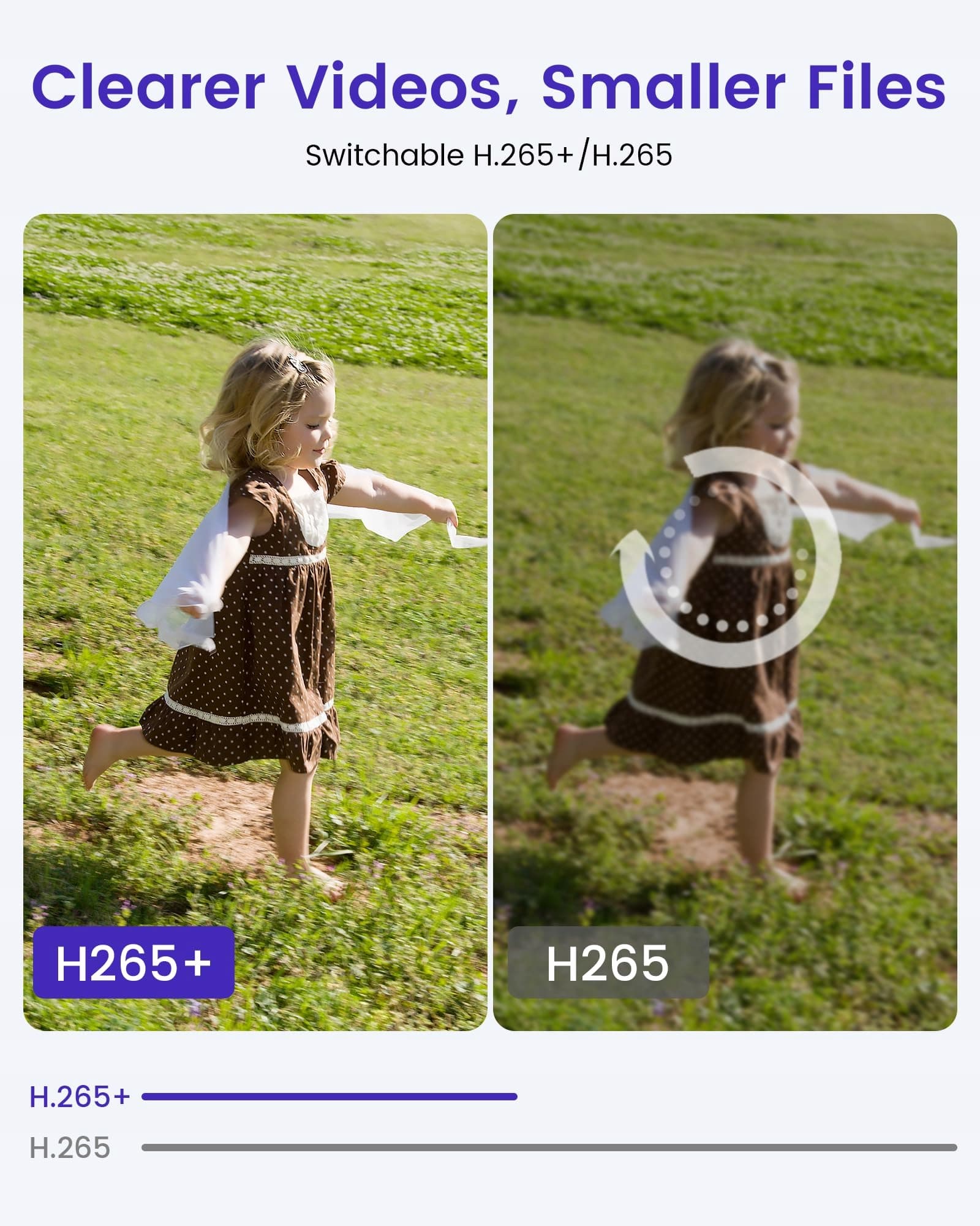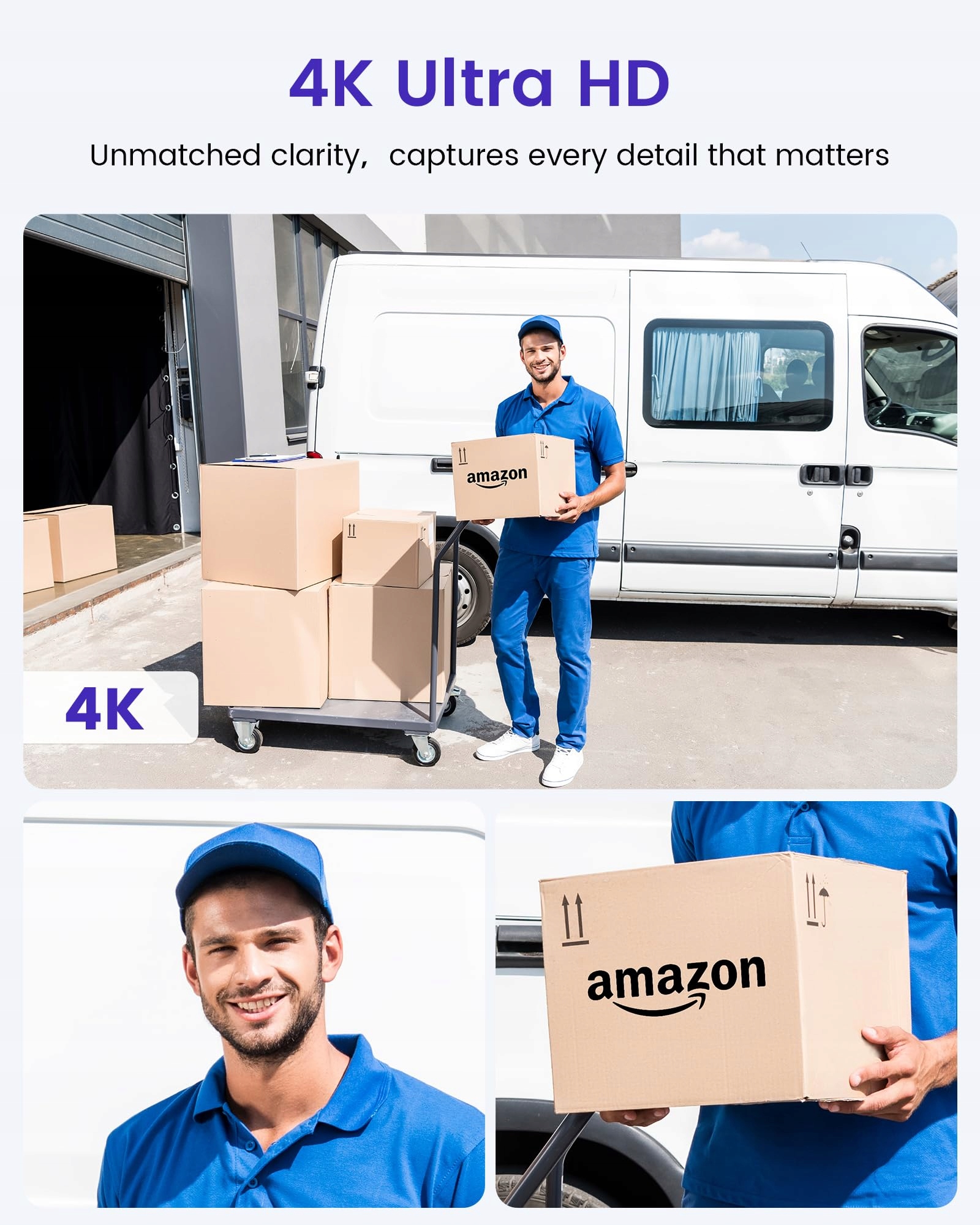 【4K Ultra HD i 30m kolorowa noktowizja】Prawdziwy obiektyw 4K f/1.6 dla ostrych nagrań przy każdym oświetleniu, wbudowane diody IR do 30m kolorowych nagrań nocnych. Dzięki technologii kompresji H.265+ wysoka jakość wideo przy połowie zapotrzebowania na pamięć, ciągły monitoring wideo dla domu, biznesu i na zewnątrz.