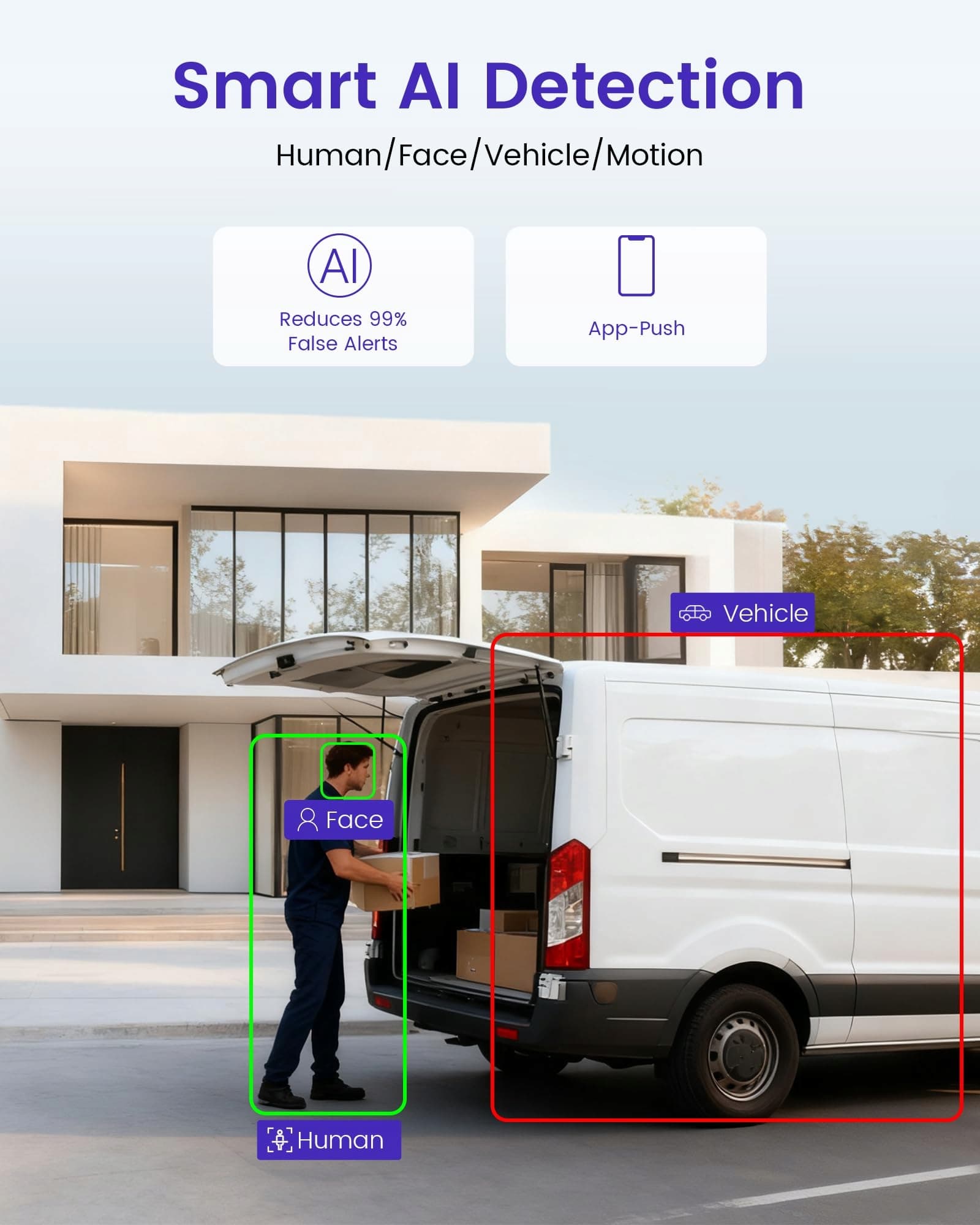 【Wykrywanie AI i dwukierunkowe audio | Bez opłat abonamentowych】Inteligentne wykrywanie osób/pojazdów AI minimalizuje fałszywe alarmy, celowane powiadomienia na smartfon. Brak miesięcznych opłat, wbudowane dwukierunkowe audio do bezpośredniej komunikacji z dowolnego miejsca – odstraszanie intruzów lub powitanie gości.