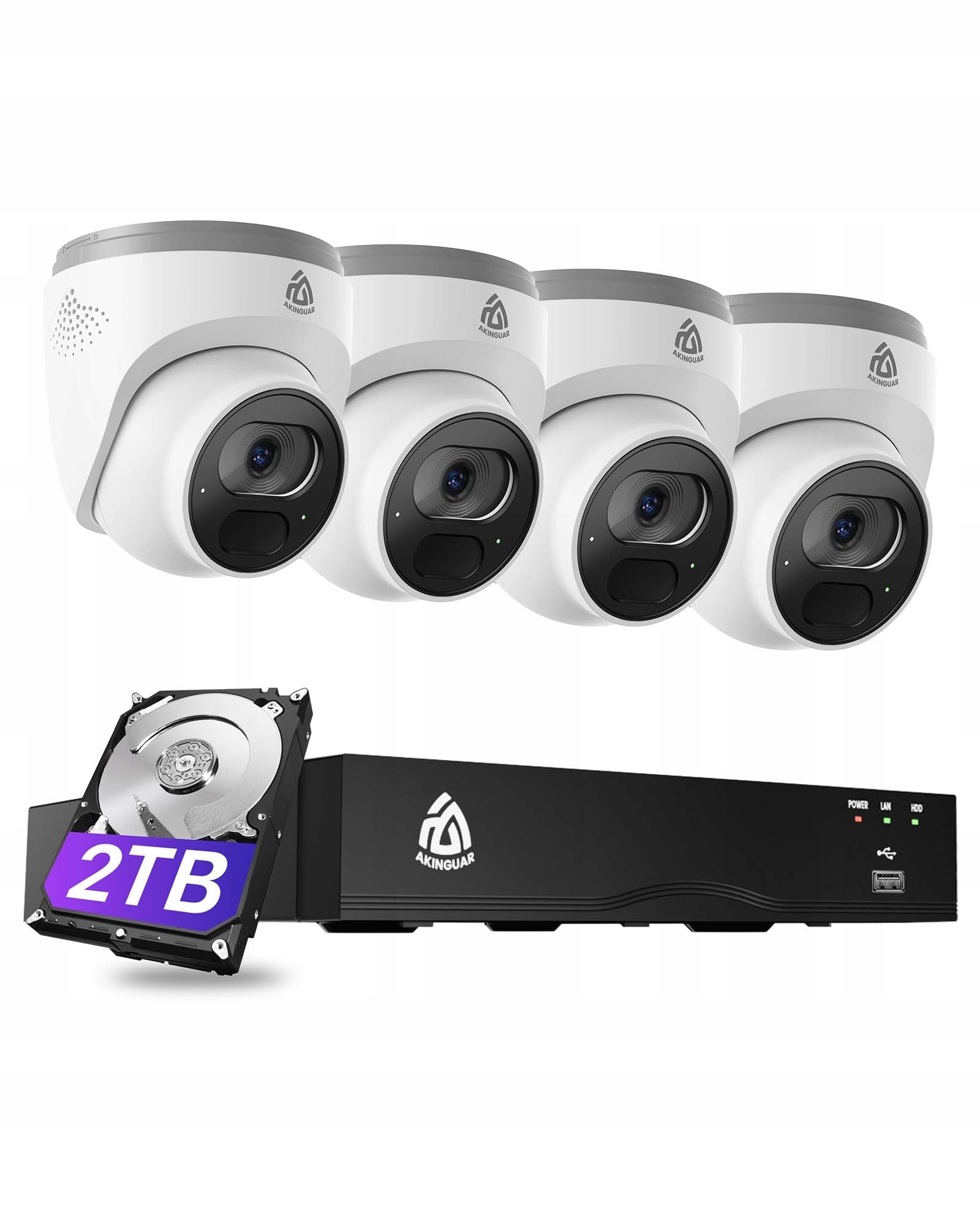 Zestaw zewnętrznych kamer monitoringu 4K, 8-kanałowy system wideo z 4x 8MP PoE IP kamerą i 2TB HDD NVR, nagrywanie 24/7 wewnątrz i na zewnątrz, rozpoznawanie osób i pojazdów, IP66, brak miesięcznych opłat