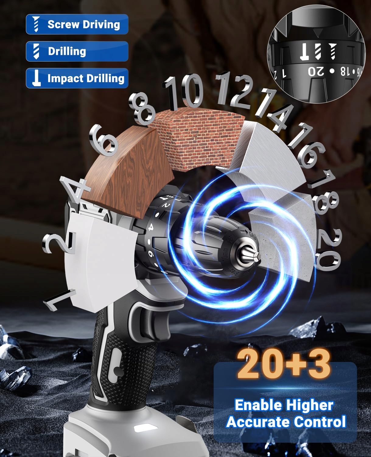【2 zmienne prędkości i 20 poziomów momentu obrotowego】Wiertarko-wkrętarka udarowa oferuje dwa zakresy prędkości (0-550 obr/min, 0-1850 obr/min), dzięki czemu masz odpowiednią moc do każdego zadania. Dzięki 20 poziomom momentu obrotowego możesz precyzyjnie ustawić odpowiedni moment dokręcania. Uchwyt Auto-Lock 10 mm umożliwia szybką wymianę bitów.
