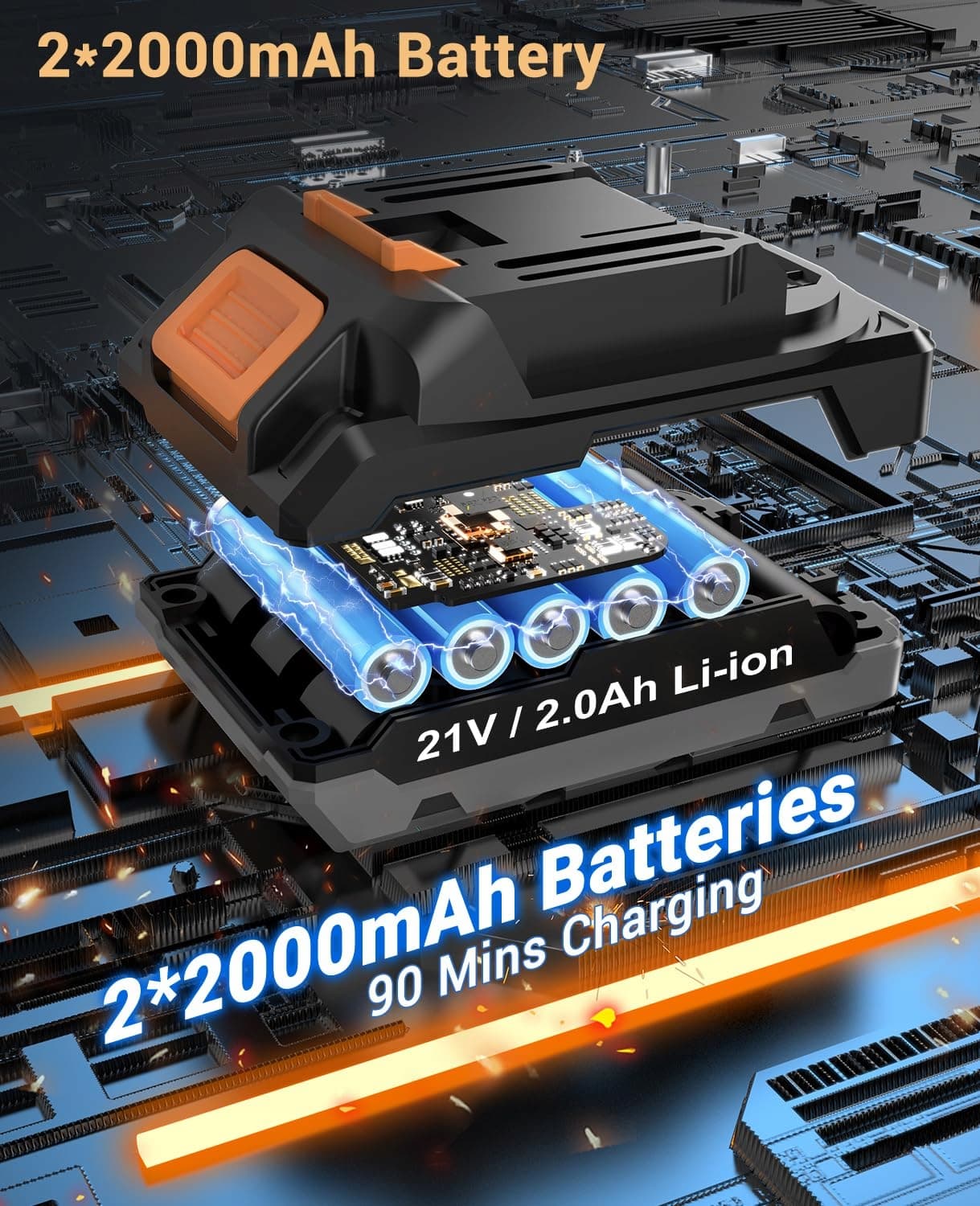 【2 akumulatory (2.0Ah) i wskaźnik baterii】Dzięki 2 mocnym akumulatorom Li-Ion 2.0Ah zawsze masz wystarczająco energii do swojego projektu. Koniec z obawami o przerwane prace. Wymiana akumulatora jest bezproblemowa, a pełne naładowanie trwa tylko 90 minut. Zintegrowany wskaźnik baterii informuje Cię na czas o stanie naładowania. Ta wiertarko-wkrętarka akumulatorowa jest Twoim niezawodnym partnerem na długie godziny pracy.