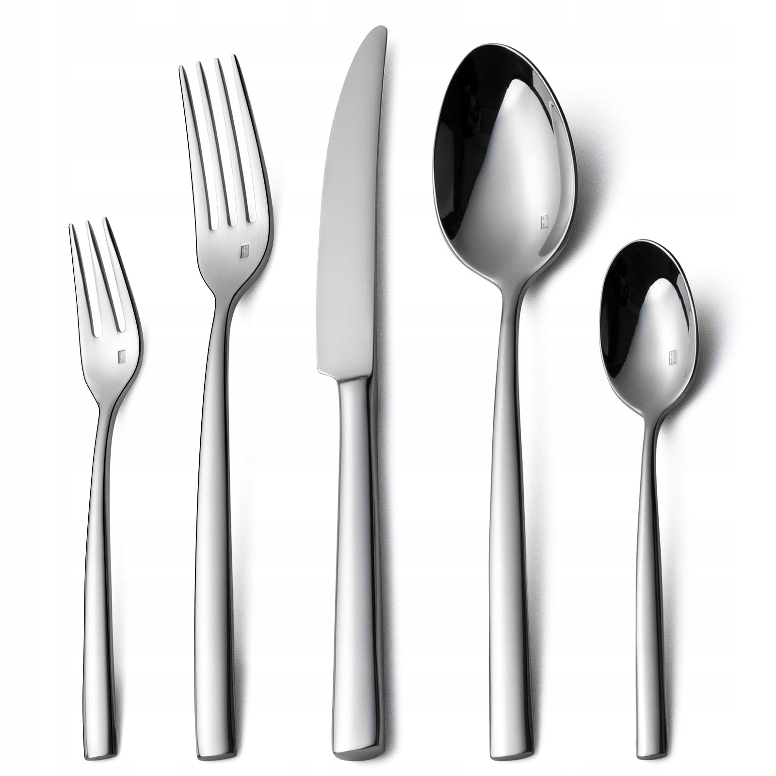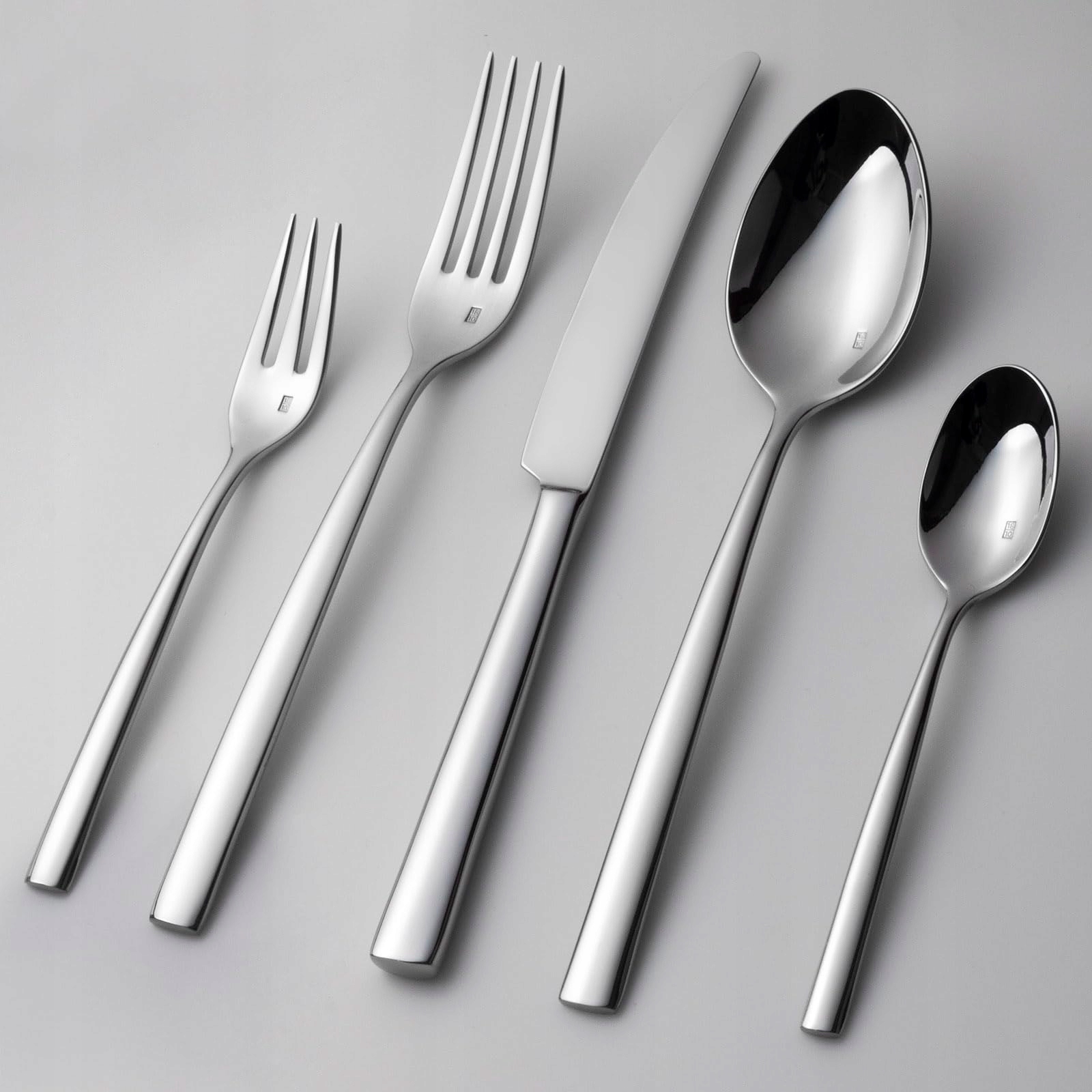 Zawartość: zestaw sztućców dla 12 osób (60 elementów): po 12 widelców, noży stołowych, łyżek, widelczyków do ciasta, łyżeczek do herbaty/kawy