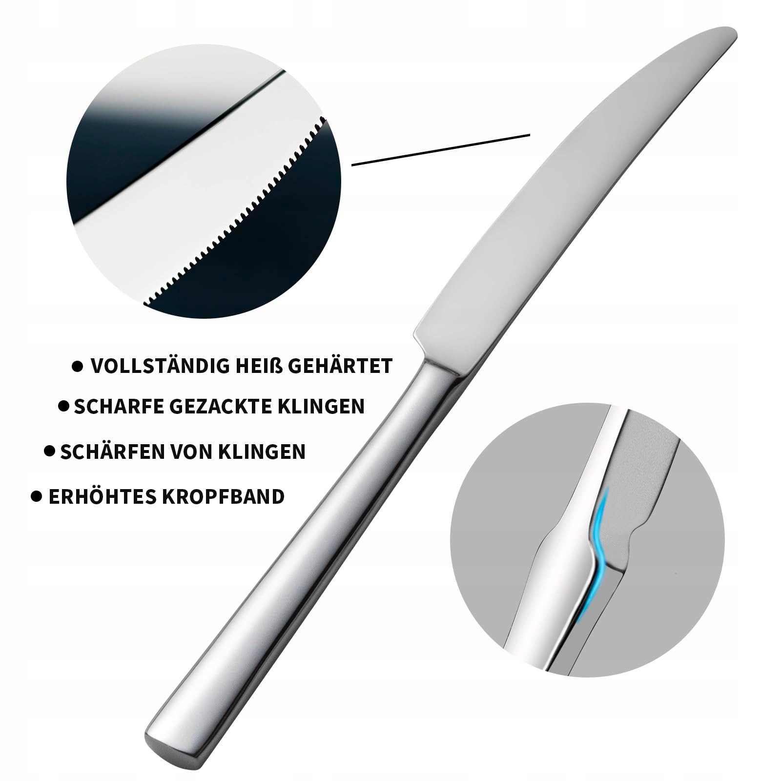 Noż monoblokowy dobrze leży w dłoni: Powierzchnie są precyzyjnie wykończone. Wszystkie krawędzie starannie zaokrąglone. Solidne noże stołowe ze stali nierdzewnej są kute z jednego kawałka i hartowane w całości