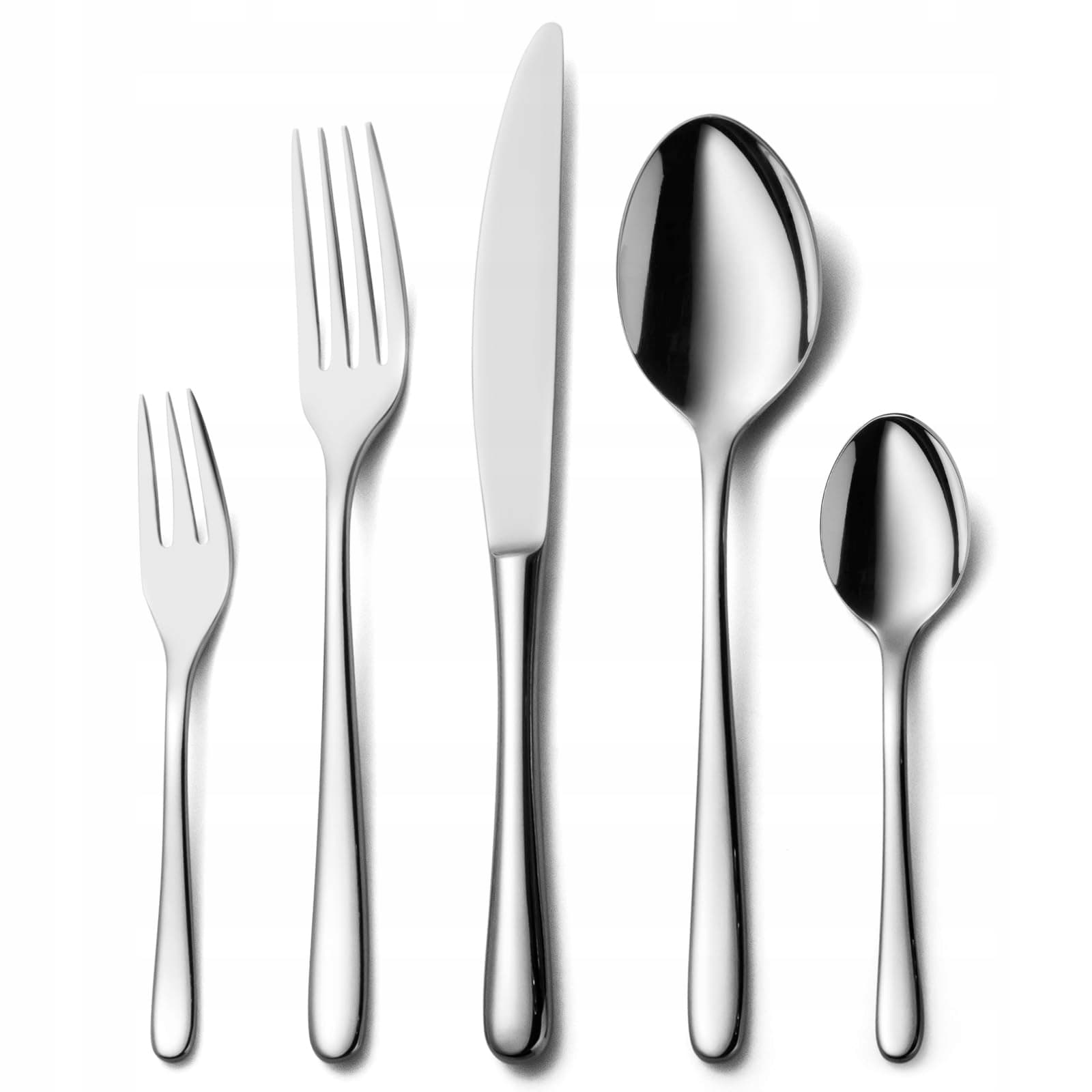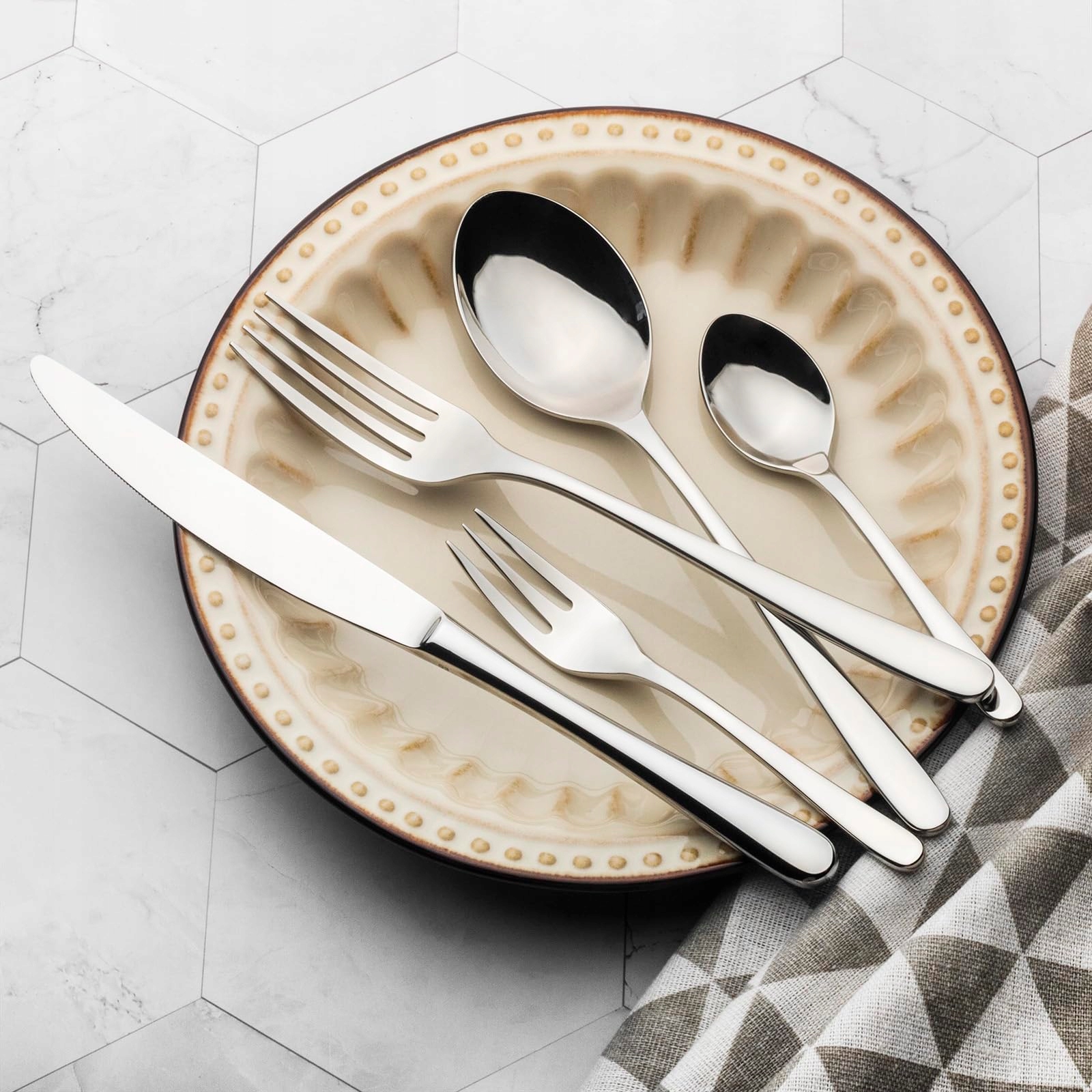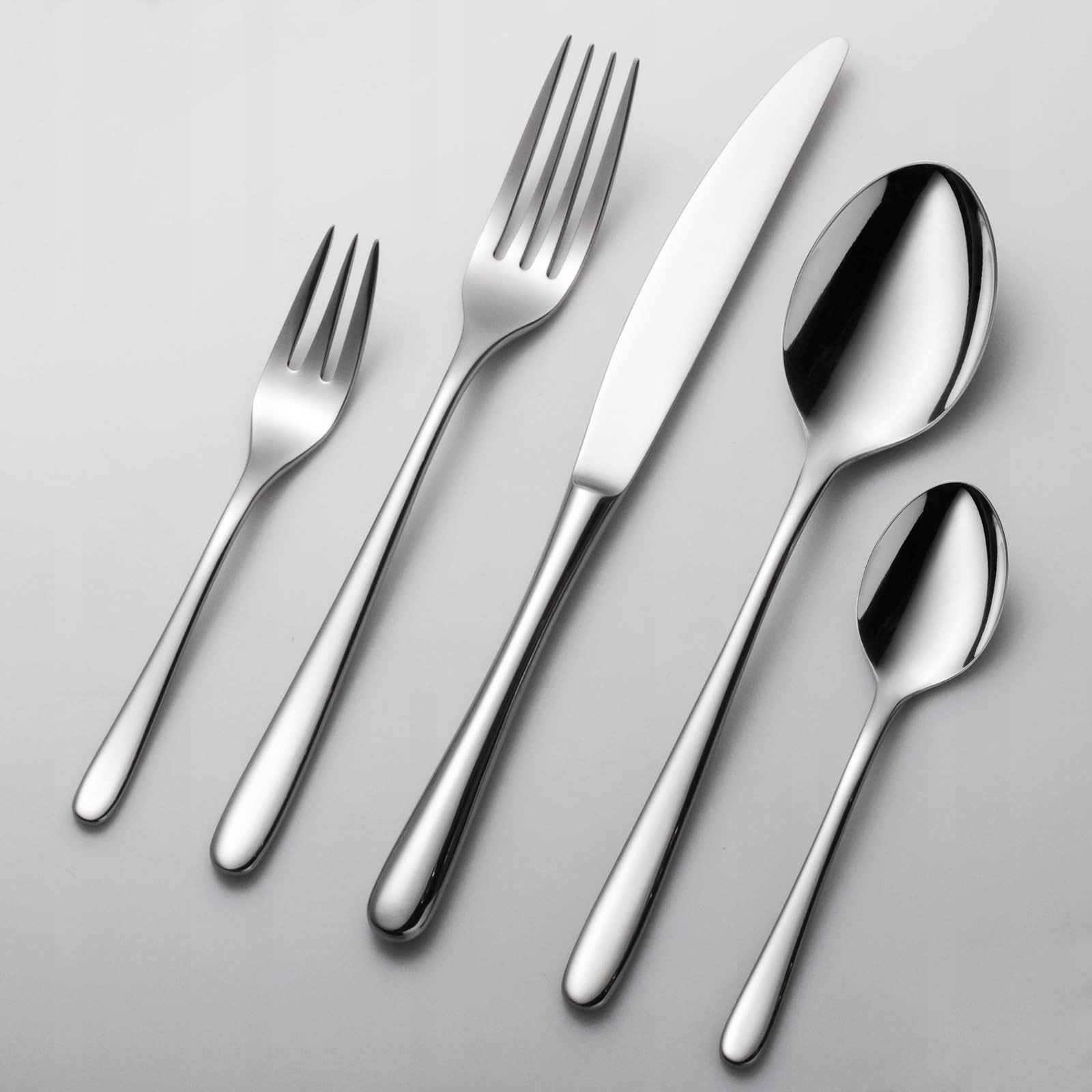 Zawartość: zestaw sztućców dla 12 osób (60 części): po 12 widelców, noży stołowych, łyżek, widelczyków do ciasta, łyżeczek do herbaty/kawy