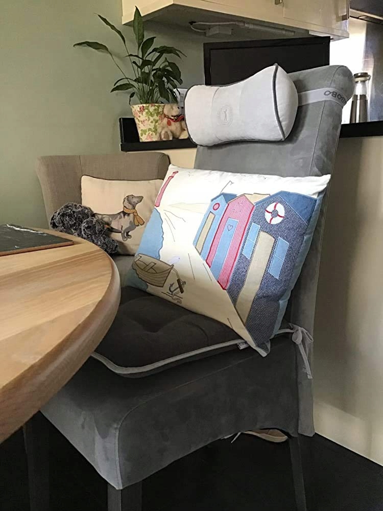 Regulowane elastyczne paski dopasowują poduszkę podpierającą szyję do różnych rozmiarów foteli samochodowych, foteli samolotowych lub biurowych.
