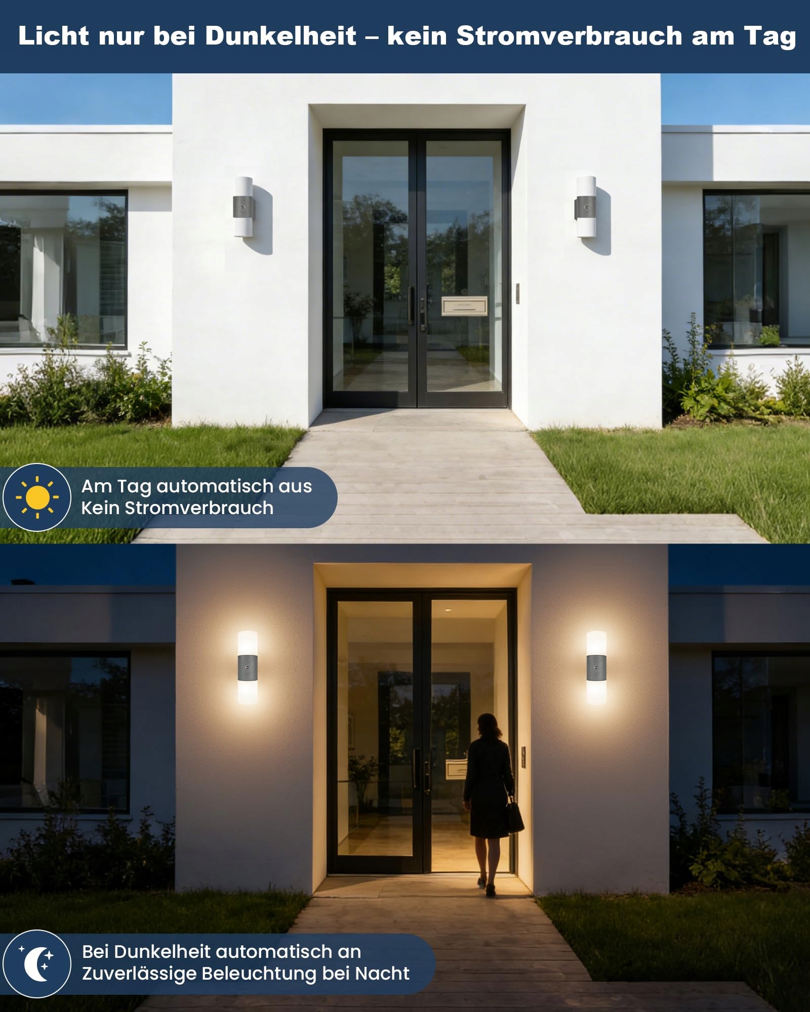 Czujnik zmierzchu i inteligentne włączanie: Ta lampa zewnętrzna wyposażona jest w czujnik zmierzchu, który automatycznie włącza ją po zmroku i wyłącza za dnia – energooszczędna, wygodna i niezawodna do każdego obszaru zewnętrznego