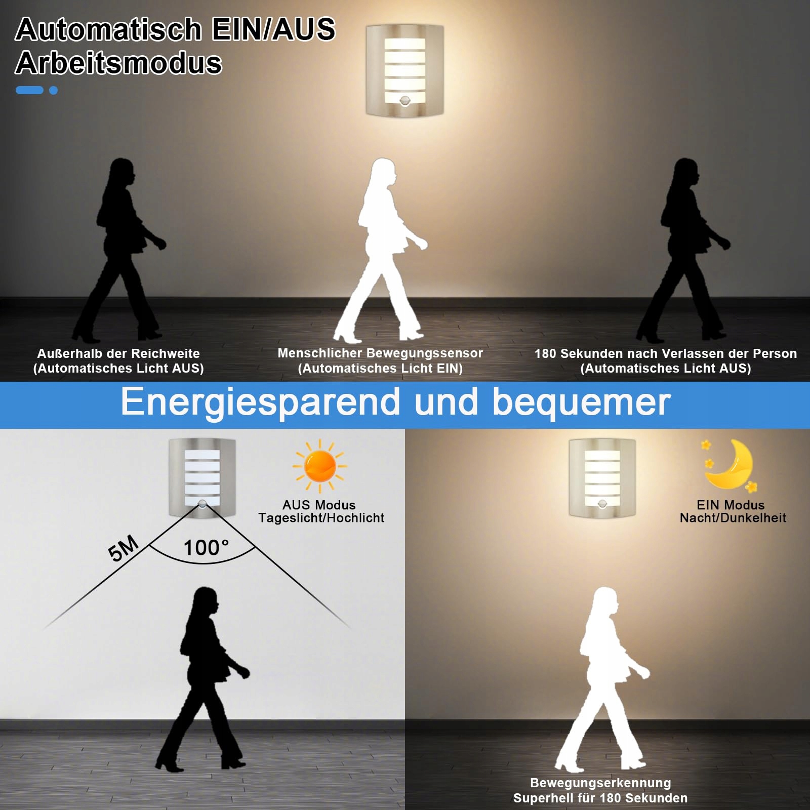 【Lampa zewnętrzna LED z czujnikiem ruchu】Wysokoprecyzyjny czujnik ruchu zapewnia, że kinkiet włącza się tylko wtedy, gdy wykryje osobę lub poruszający się obiekt w promieniu do 5 metrów. Automatycznie włącza i wyłącza światło, co zapewnia zarówno wygodę, jak i bezpieczeństwo.
