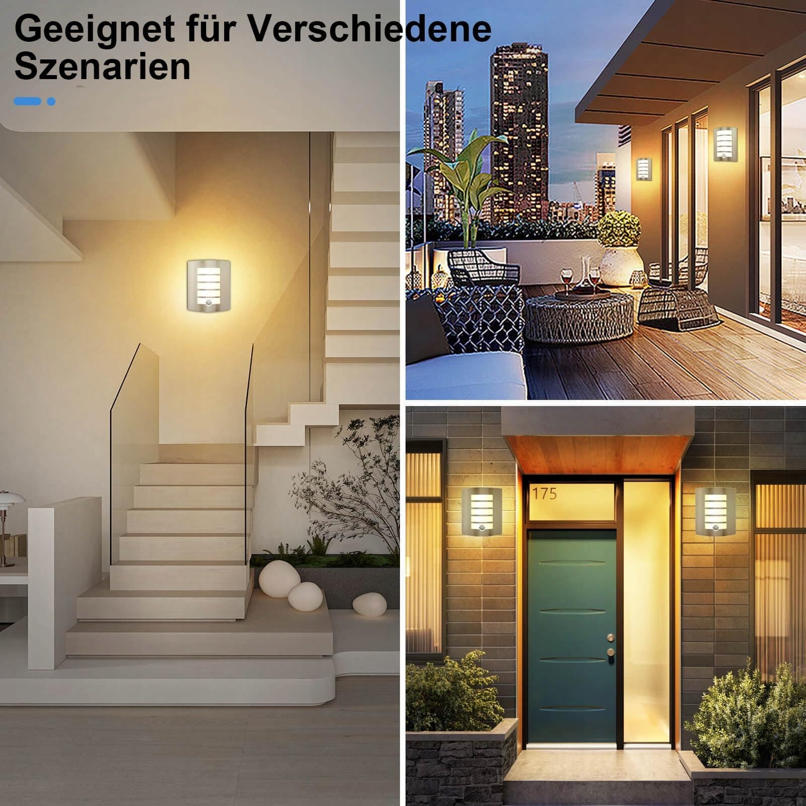 【Wodoodporna lampa zewnętrzna IP44】Ta lampa z czujnikiem ruchu wykonana jest z wytrzymałej stali nierdzewnej i trwałego tworzywa ABS o wysokiej ochronie i odporności na wilgoć, nadaje się do montażu przy drzwiach wejściowych, w ogrodach, korytarzach, na tarasach, podwórkach, balkonach, werandach, łazienkach i innych miejscach.