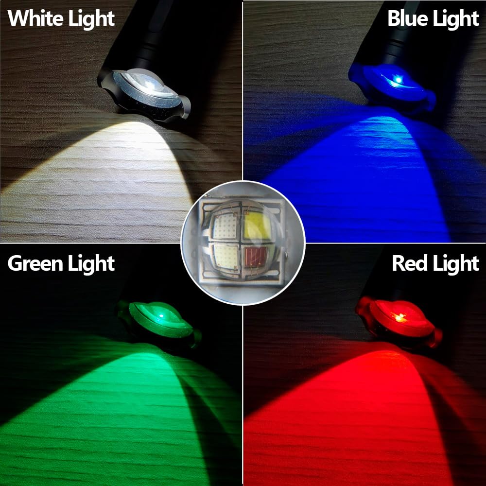 【4 różne zmiany kolorów】Latarka RGBW 4 w 1 z wielokolorowymi diodami LED ma 4 pojedyncze źródła światła LED (czerwony, zielony, niebieski, biały), które mają wysoką jasność, zasięg światła do 100~200 metrów, każdy kolor światła może migać, latarka RGB spełnia Twoje różne wymagania