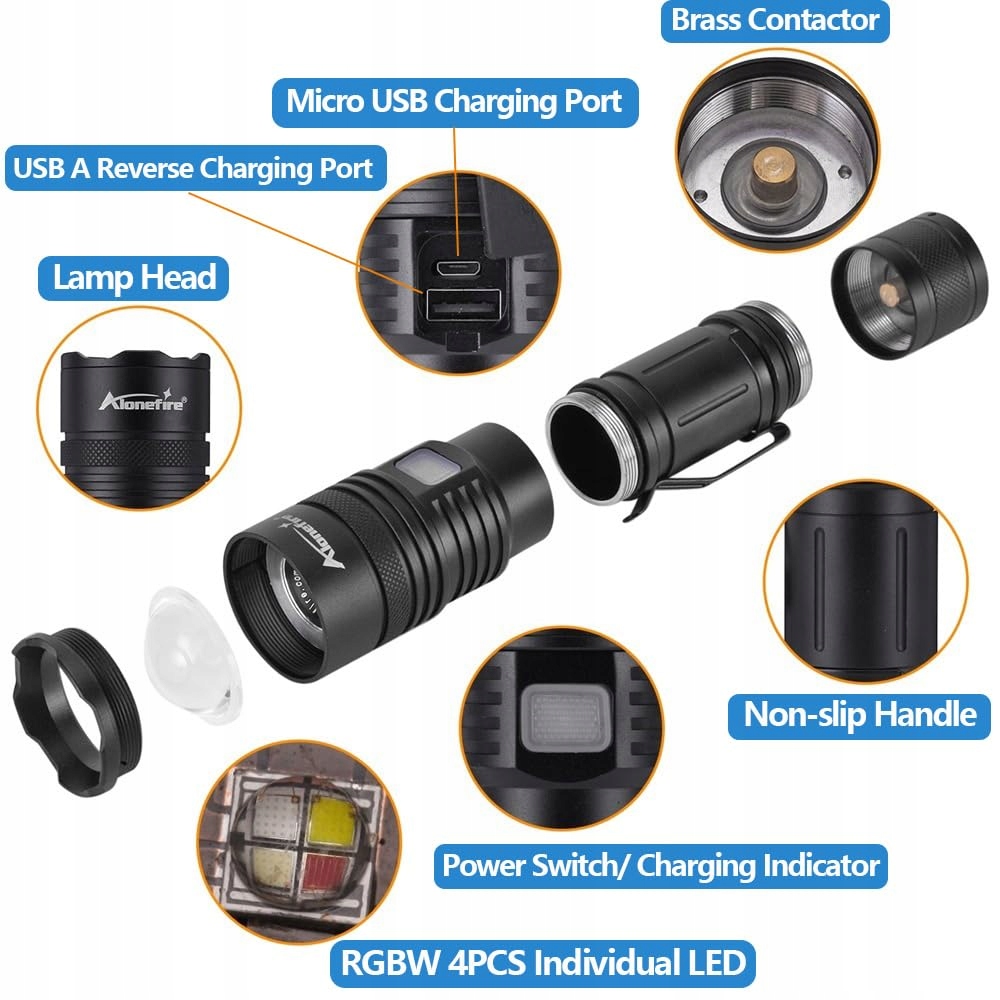 ALONEFIRE X37 Latarka Taktyczna LED 4 Kolory USB Wodoodporna Outdoor | Premium Supply