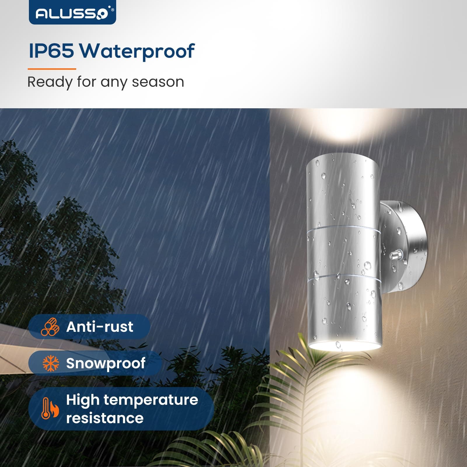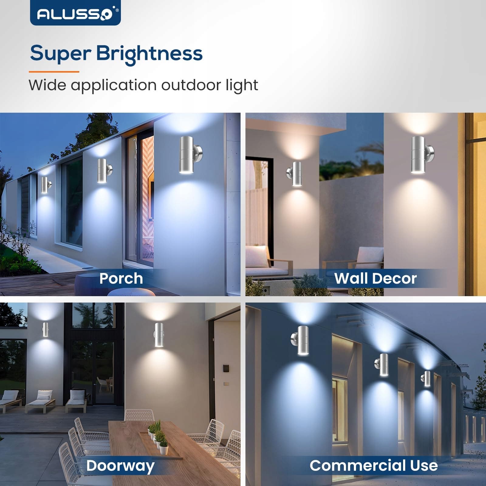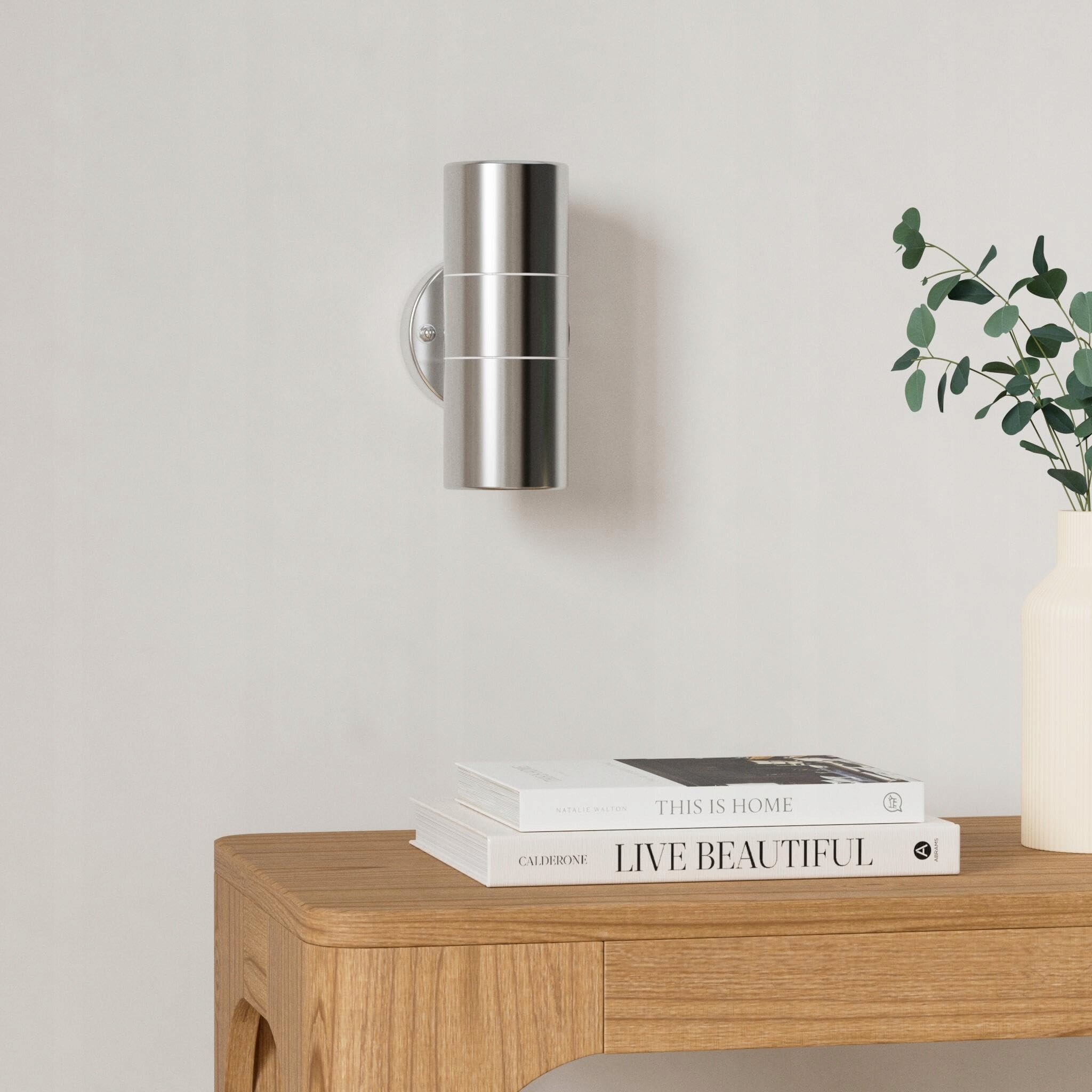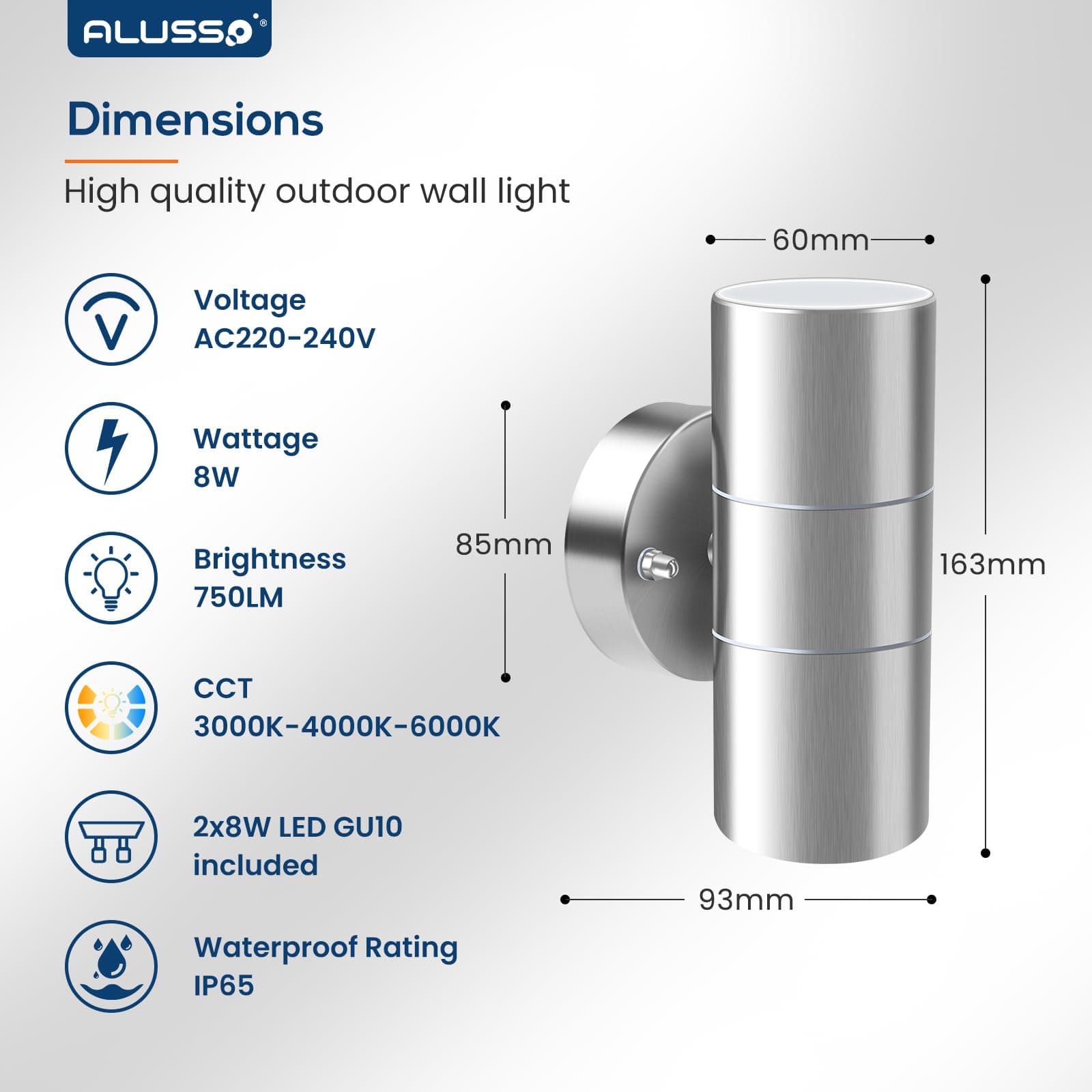 Zewnętrzna lampa ścienna, lampa góra-dół ze stali nierdzewnej, 2 x 8 W żarówki LED GU10 w zestawie, 3 przełączalne temperatury barwowe, wodoodporne srebrne światło zewnętrzne IP65 do korytarza i werandy