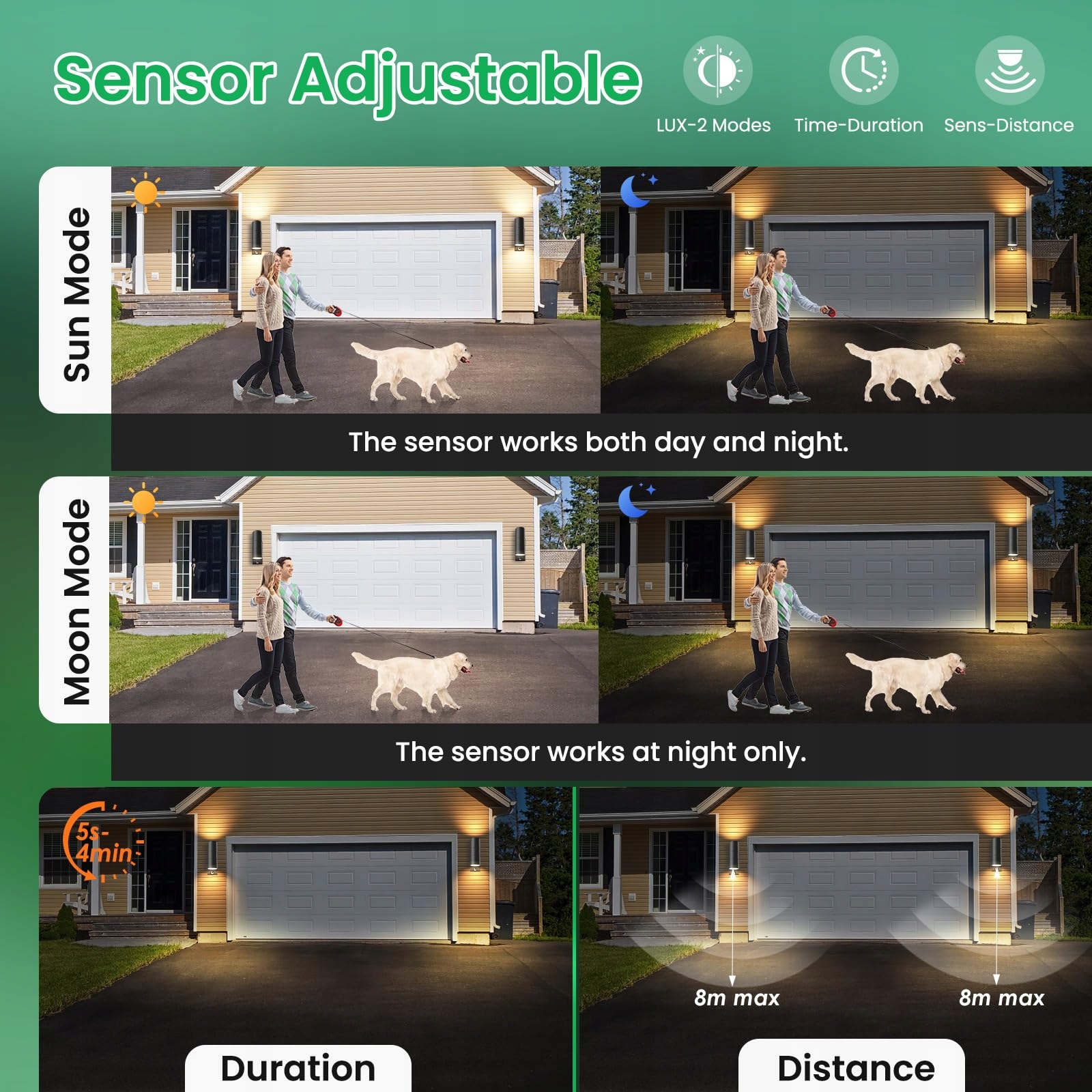 【Kinkiet z czujnikiem ruchu PIR】 Czujnik kinkietu posiada trzy tryby ustawień, które pozwalają dostosować zasięg wykrywania czujnika ruchu (maks. 8 m), czułość działania (dzień i noc) oraz czas świecenia według potrzeb (5s-4 min). Czujnik ruchu ma kąt wykrywania 90 stopni przy zalecanej wysokości montażu 1,8-2,5 metra.