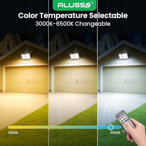 ALUSSO lampy solarne na zewnątrz z czujnikiem ruchu, 3CCT ciepła biel 3000K—zimna biel 6500K ściemnialna lampa solarna LED na zewnątrz, IP54 lampa ścienna solarna, 3 tryby reflektora z pilotem do garażu