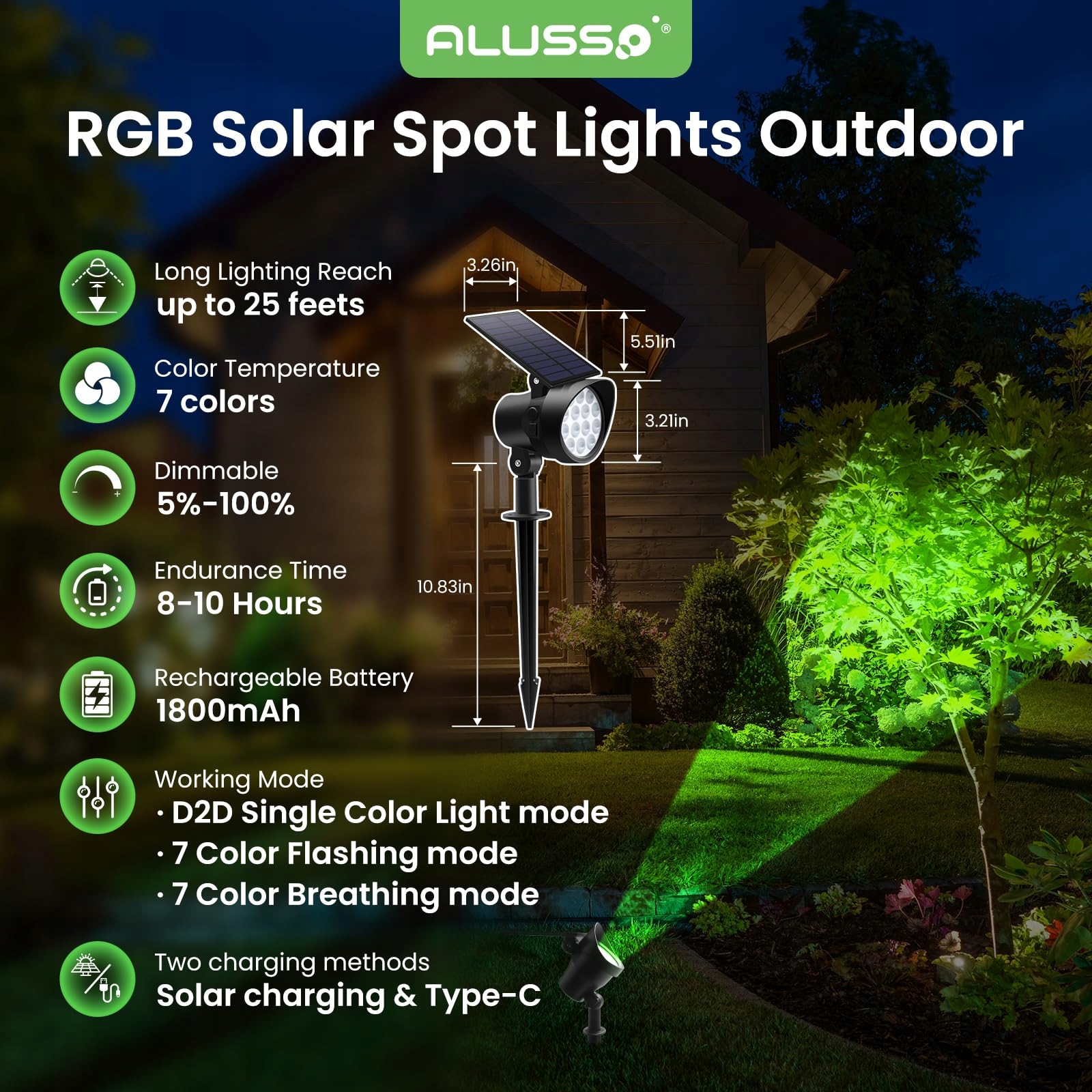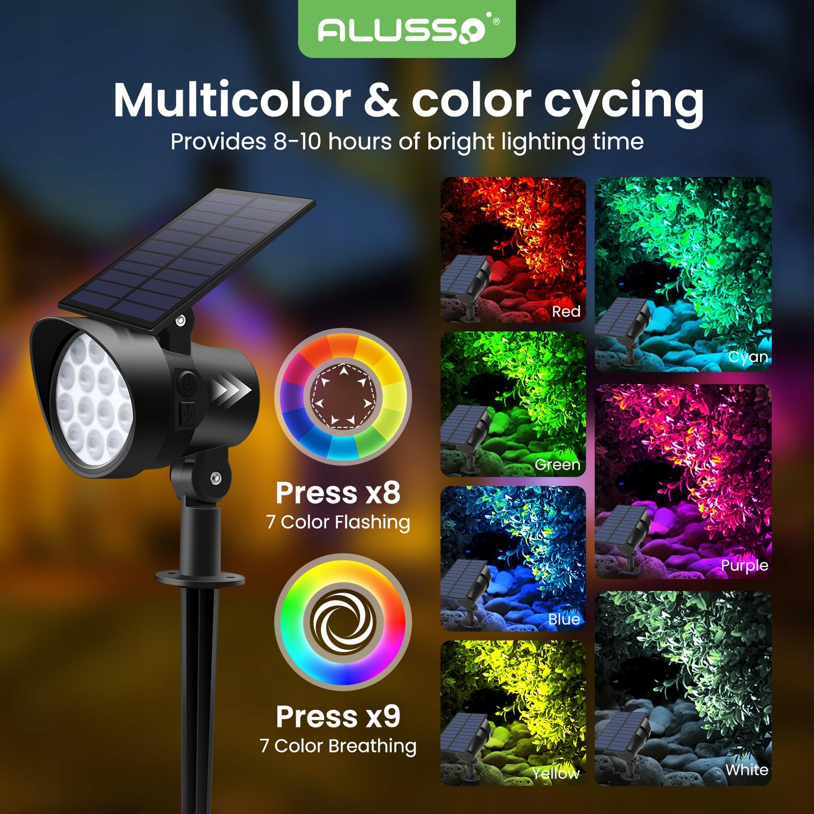ALUSSO 4 sztuki RGB solarnych lamp ogrodowych, kolorowe lampy solarne na zewnątrz do ogrodu, IP65 wodoodporne reflektory solarne na zewnątrz, kolorowe lampy solarne do ogrodu, ścieżki, tarasu, dekoracje na Halloween i Boże Narodzenie, 3 tryby