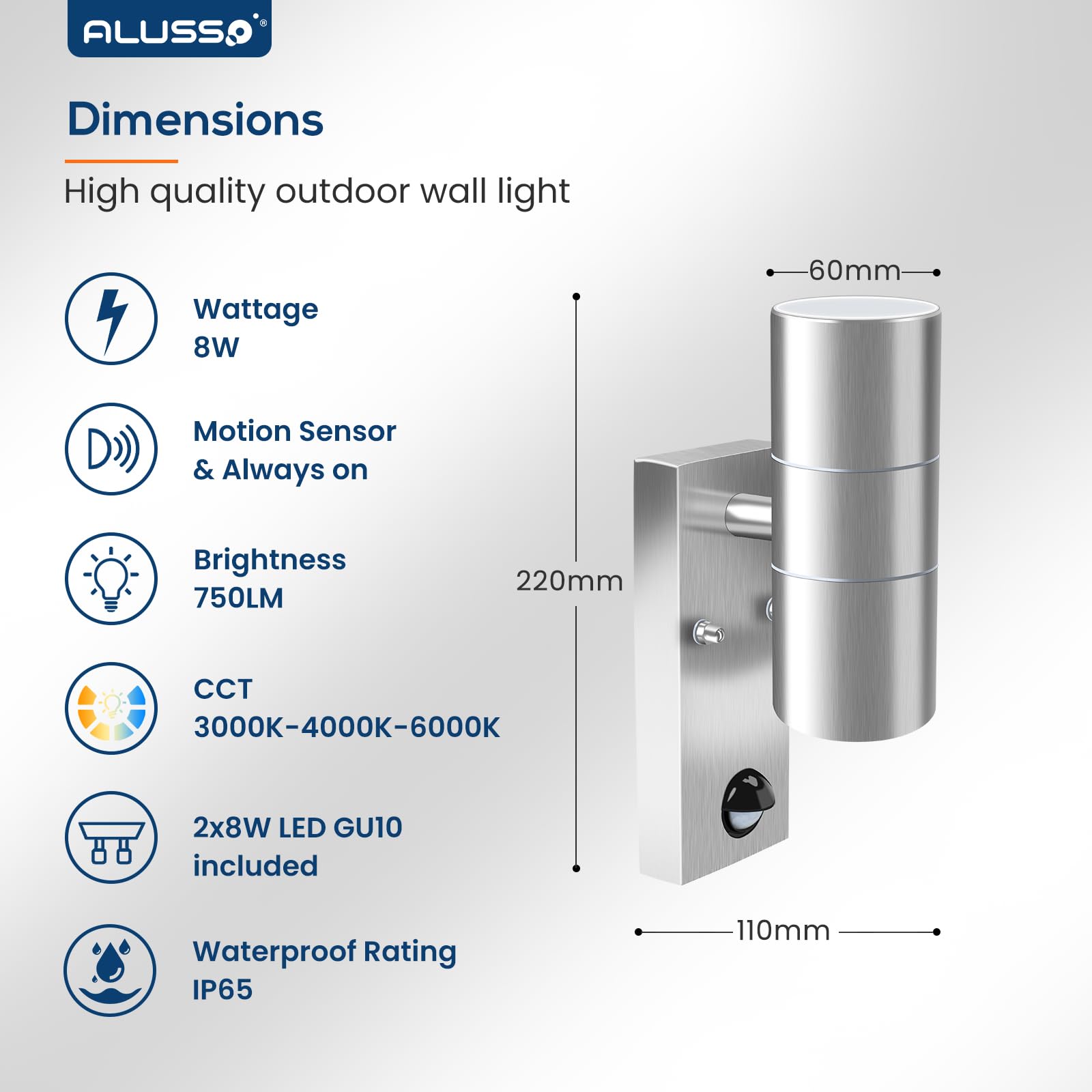 ALUSSO zewnętrzne lampy ścienne z czujnikiem ruchu, lampa górna i dolna z czujnikiem PIR, stal nierdzewna IP65 wodoodporna srebrna lampa zewnętrzna do bezpieczeństwa, 2 x 8W żarówki LED GU10 w zestawie, 3 temperatury barwowe