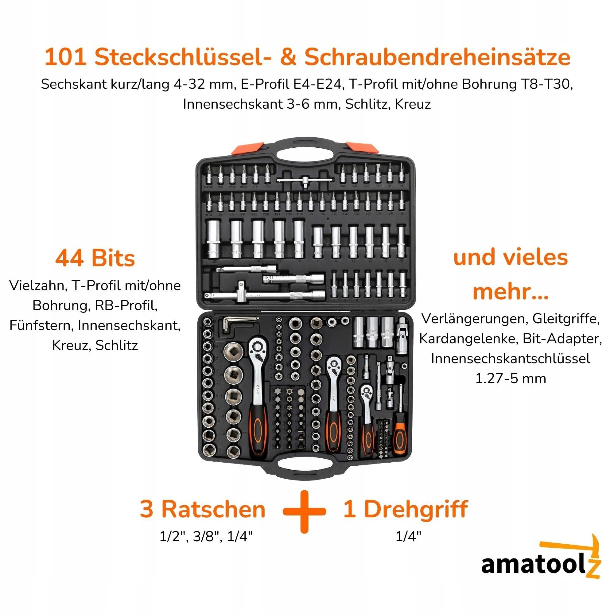 Amatoolz Zestaw kluczy nasadowych 171 szt I Skrzynka narzędziowa wypełniona I Duży zestaw kluczy nasadowych I Skrzynka na klucze 1/2' 1/4' 3/8' cal I wszystkie popularne bity i nasadki w zestawie