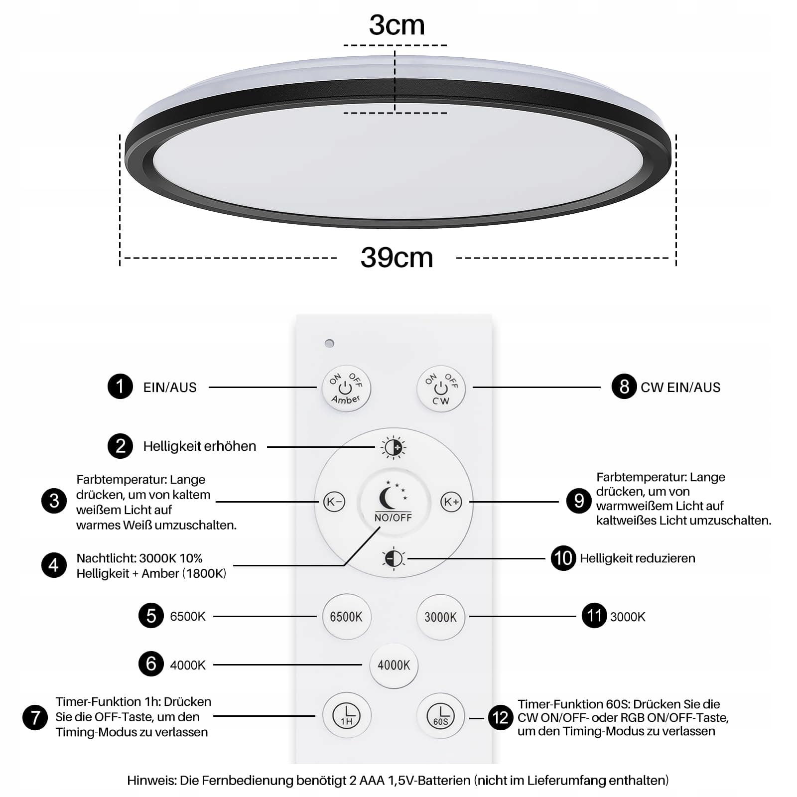 AmazeFan LED Lampa sufitowa z regulacją jasności - 34W 3400LM Lampa sufitowa z pilotem - 8W Nocna lampa LED ciepła do sypialni, pokoju dziecięcego, salonu - Okrągła (34W-39CM-Czarna)