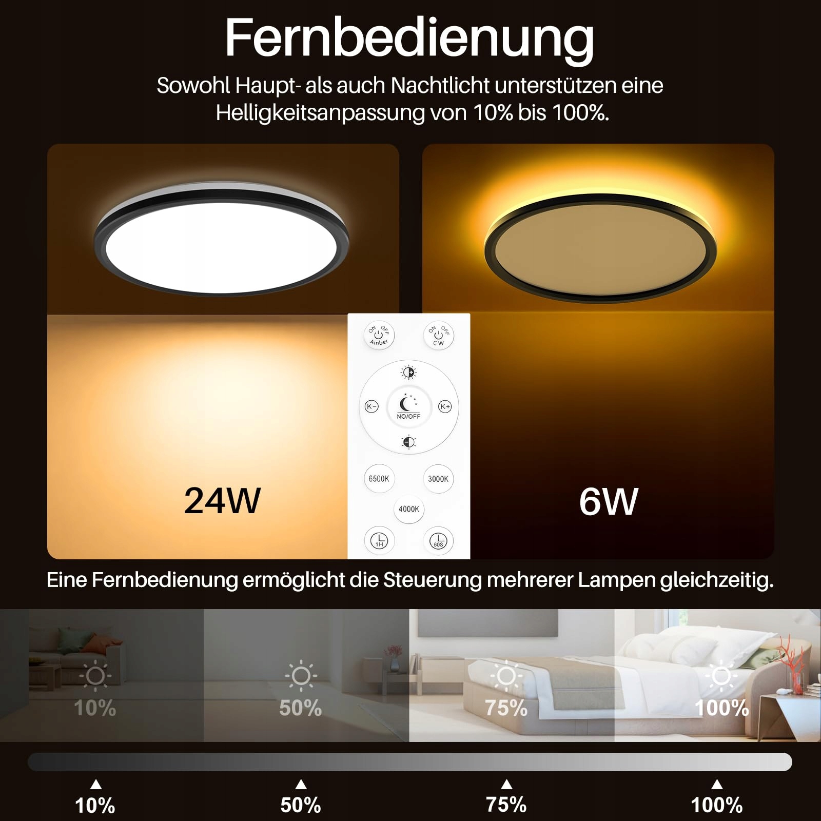 AmazeFan LED Lampa sufitowa z regulacją jasności - 24W 2400LM Lampa sufitowa z pilotem - 6W Nocna lampka ciepła - Płaska lampa sufitowa do sypialni, pokoju dziecięcego, salonu - Okrągła (24W-29CM-Czarna)