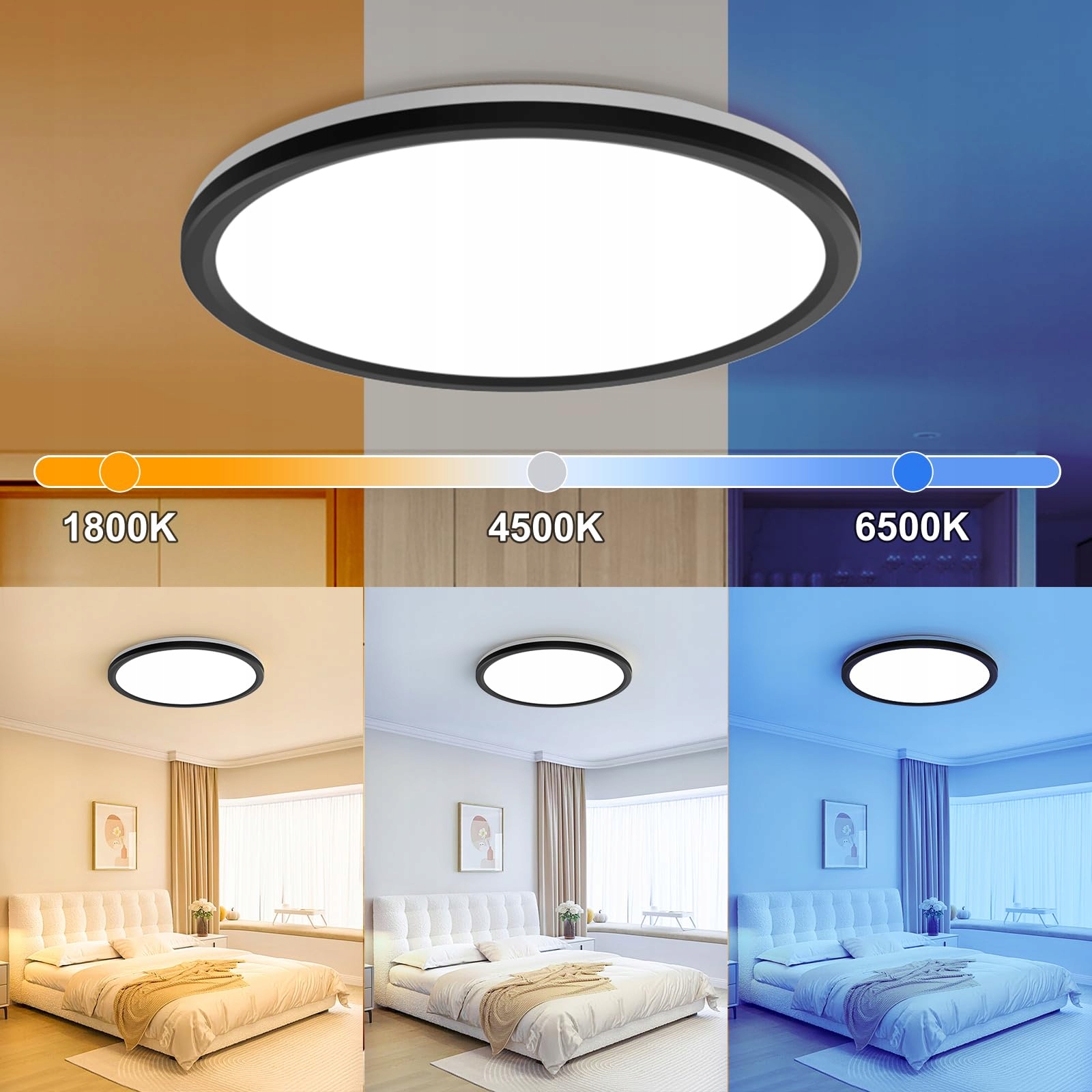 Indywidualny wybór temperatury barwowej: Ta lampa sufitowa oferuje zakres temperatury barwowej od 1800K do 6500K, zapewniając przyjemne doświadczenie świetlne. Możesz wybierać między światłem neutralnym, ciepłym, zimnym lub podświetleniem, aby sprostać różnym wymaganiom oświetleniowym i indywidualnym preferencjom. Oprócz wyboru temperatury barwowej, ta lampa sufitowa ma również funkcje swobodnego wyboru trybu światła i jasności.