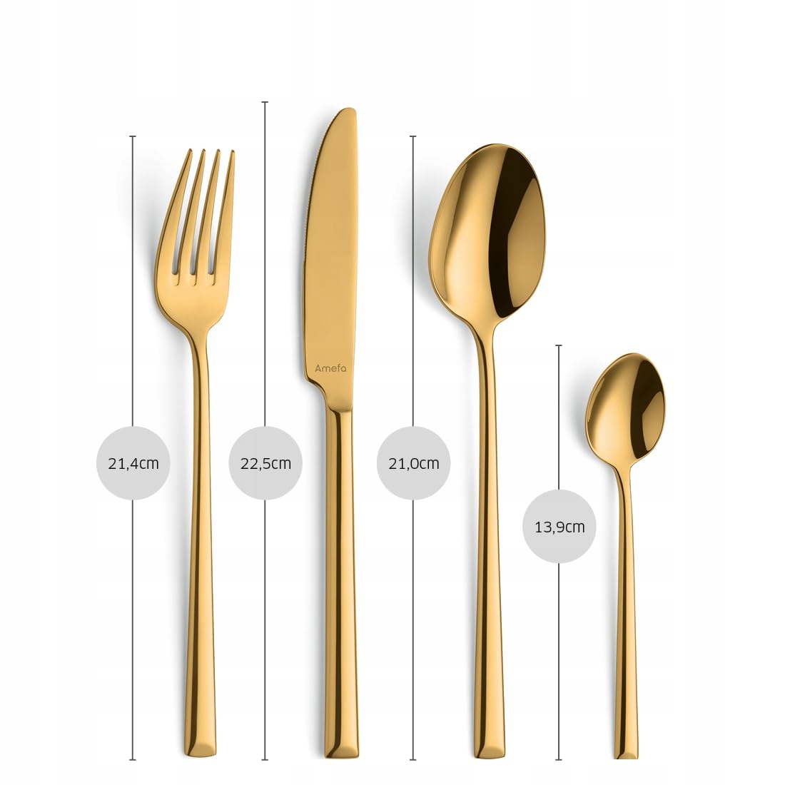 SZCZEGÓŁY: Zestaw sztućców dla 6 osób, materiał: stal ostrzowa 13/0, stal nierdzewna 18/10, wykończenie: wysoko polerowane, powłoka PVD, nierdzewne, zalecane mycie ręczne.