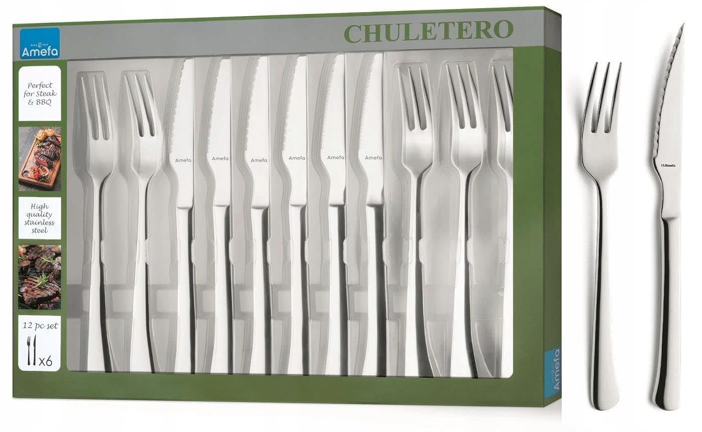 Amefa CHULETERO 7038, 12-częściowy zestaw sztućców do steków i pizzy, sztućce dla 6 osób, 6 x nóż do steków, 6 x widelec do steków, stal nierdzewna 18/10, odporna na rdzę i polerowana