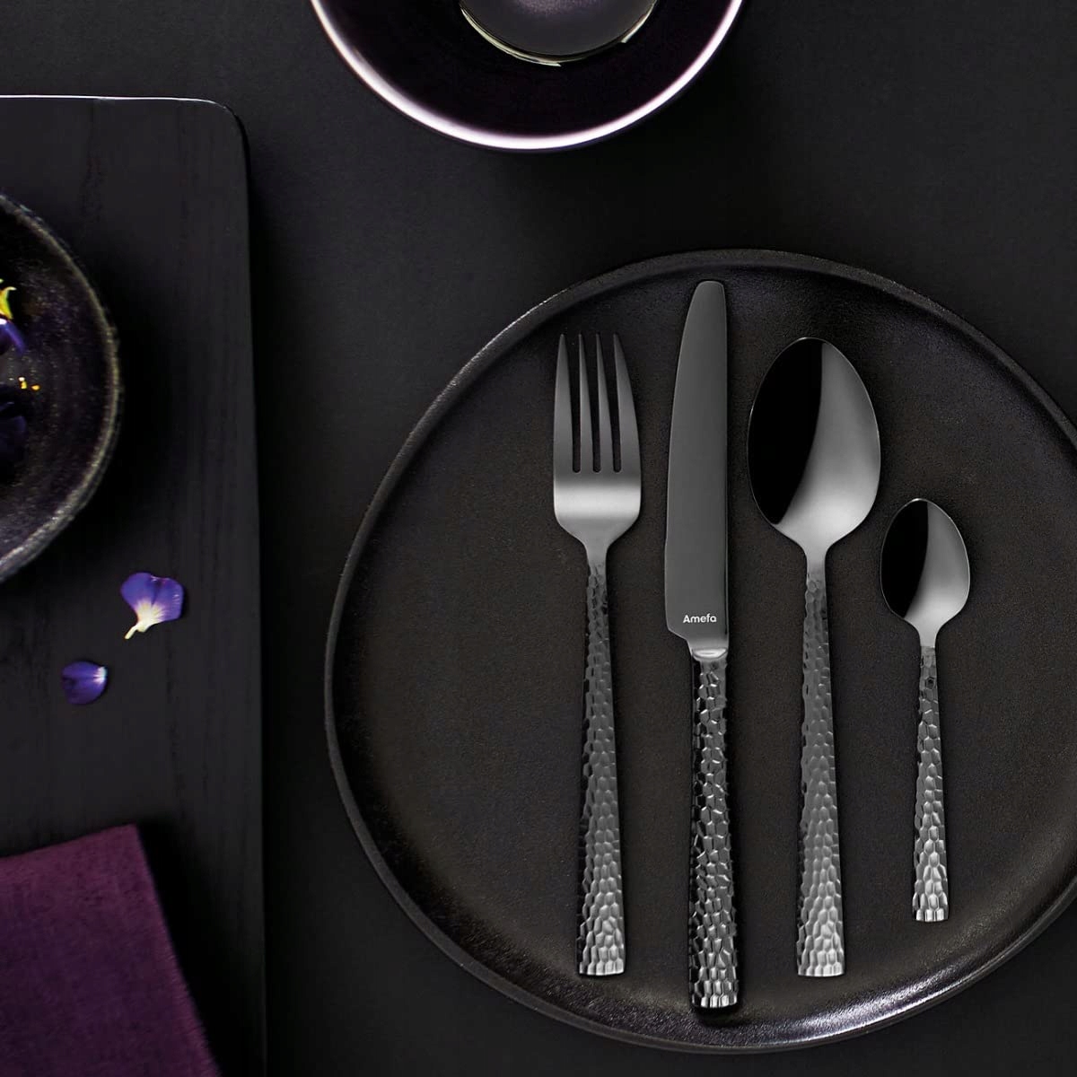 Zestaw sztućców Amefa PVD Felicity, czarne sztućce, 24-elementowy zestaw sztućców czarnych, dla 6 osób, stal nierdzewna 18/0, stal klingowa 13/0, młotkowany uchwyt, z nożem, widelcem, łyżką i łyżeczką do kawy