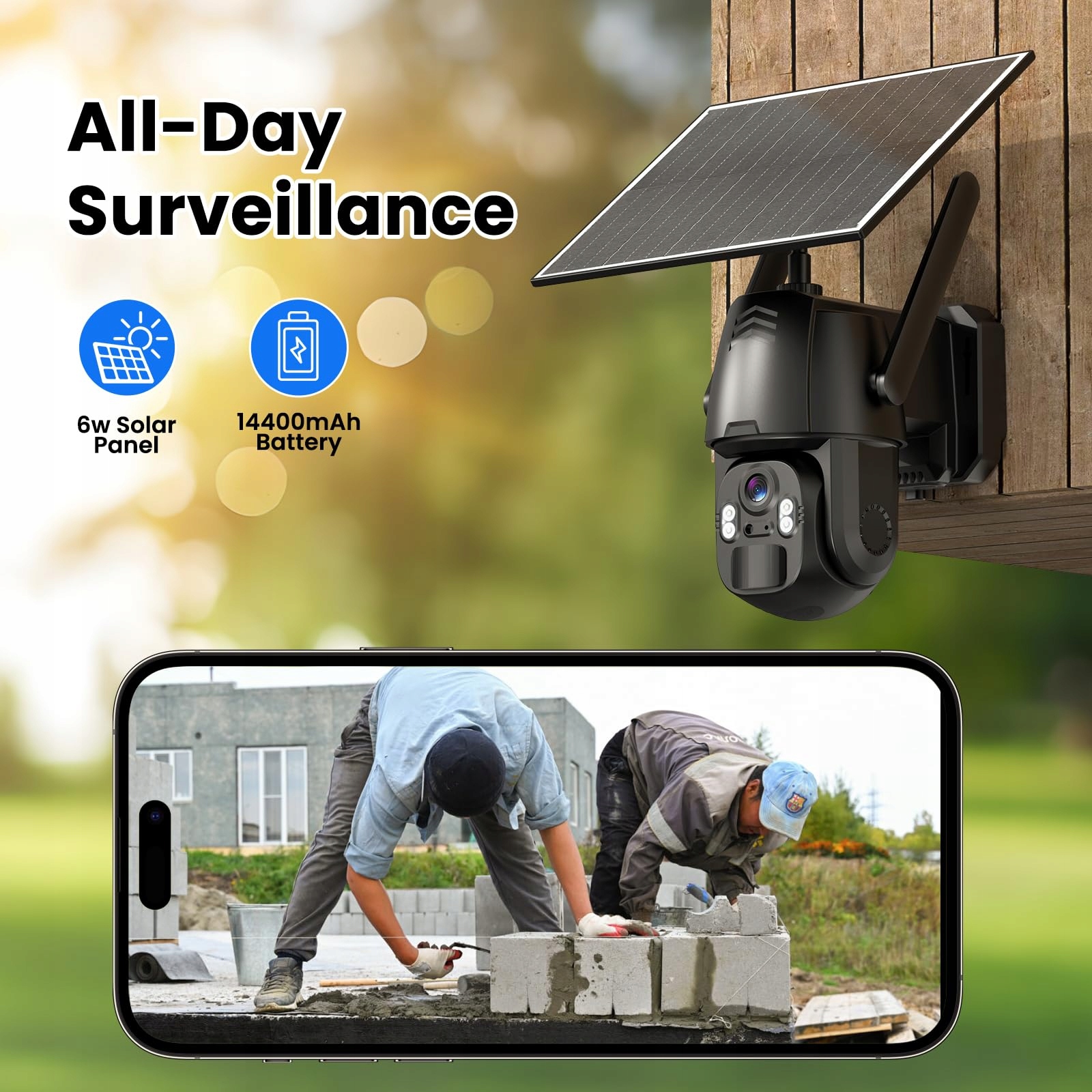 【100% niezależne zasilanie】Wbudowany panel solarny 6 W i akumulator 14400 mAh zapewniają nieprzerwane zasilanie. Idealne do odległych miejsc bez dostępu do prądu, ponieważ nie wymaga ręcznego ładowania ani skomplikowanego okablowania.