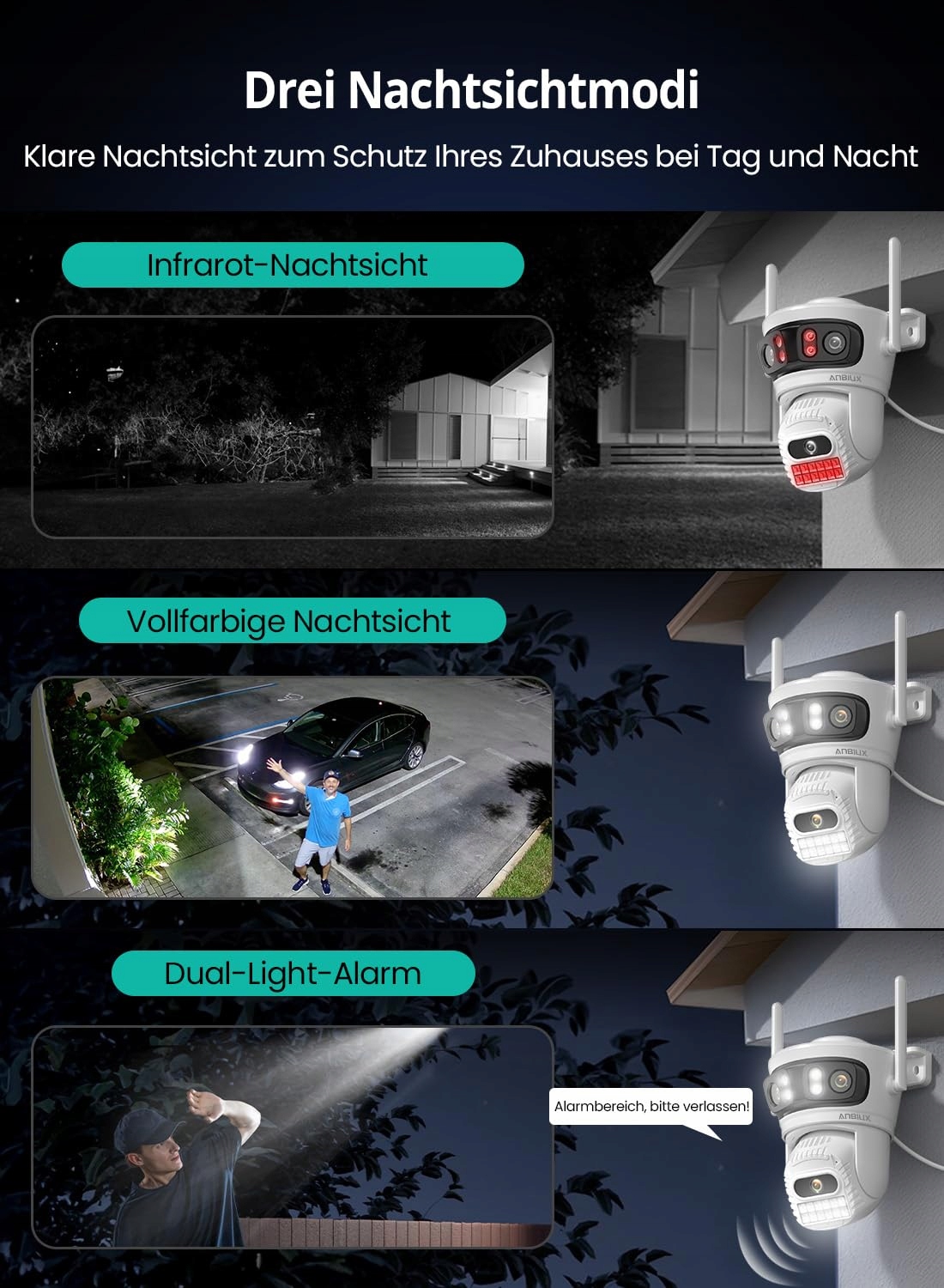 【Rozdzielczość 2K UHD i widzenie nocne do 30 m】Kamera monitoringu zewnętrznego łączy 14 białych diod LED i 14 diod podczerwieni, oferując trzy tryby widzenia nocnego: podczerwień, nagrywanie kolorowe i podwójny alarm świetlny. Kolorowe widzenie nocne ma zasięg do 30 metrów, dzięki czemu nawet w nocy możesz oglądać wyraźne kolorowe nagrania w rozdzielczości UHD.