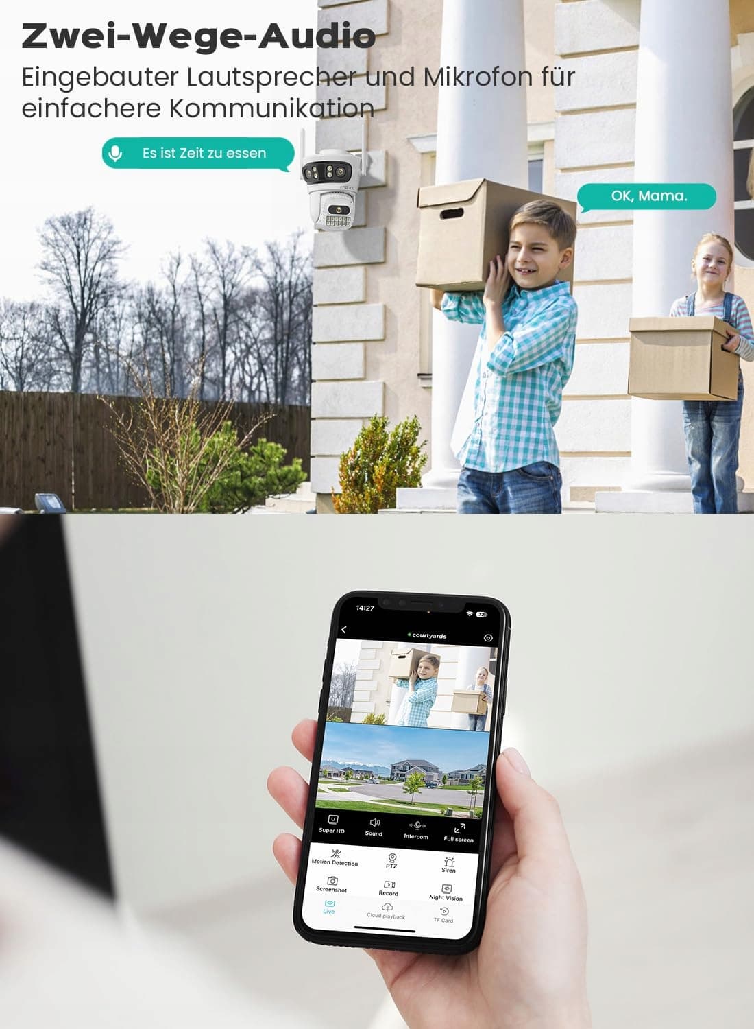 【Dwukierunkowe audio i dostęp dla wielu użytkowników】Ta kamera outdoor obsługuje dwukierunkowe audio, dzięki czemu możesz w każdej chwili komunikować się z gośćmi lub ostrzegać intruzów. Ponadto kamera IP obsługuje dostęp dla wielu użytkowników, dzięki czemu Twoja rodzina, przyjaciele lub służby ochrony mogą wspólnie monitorować kamerę.