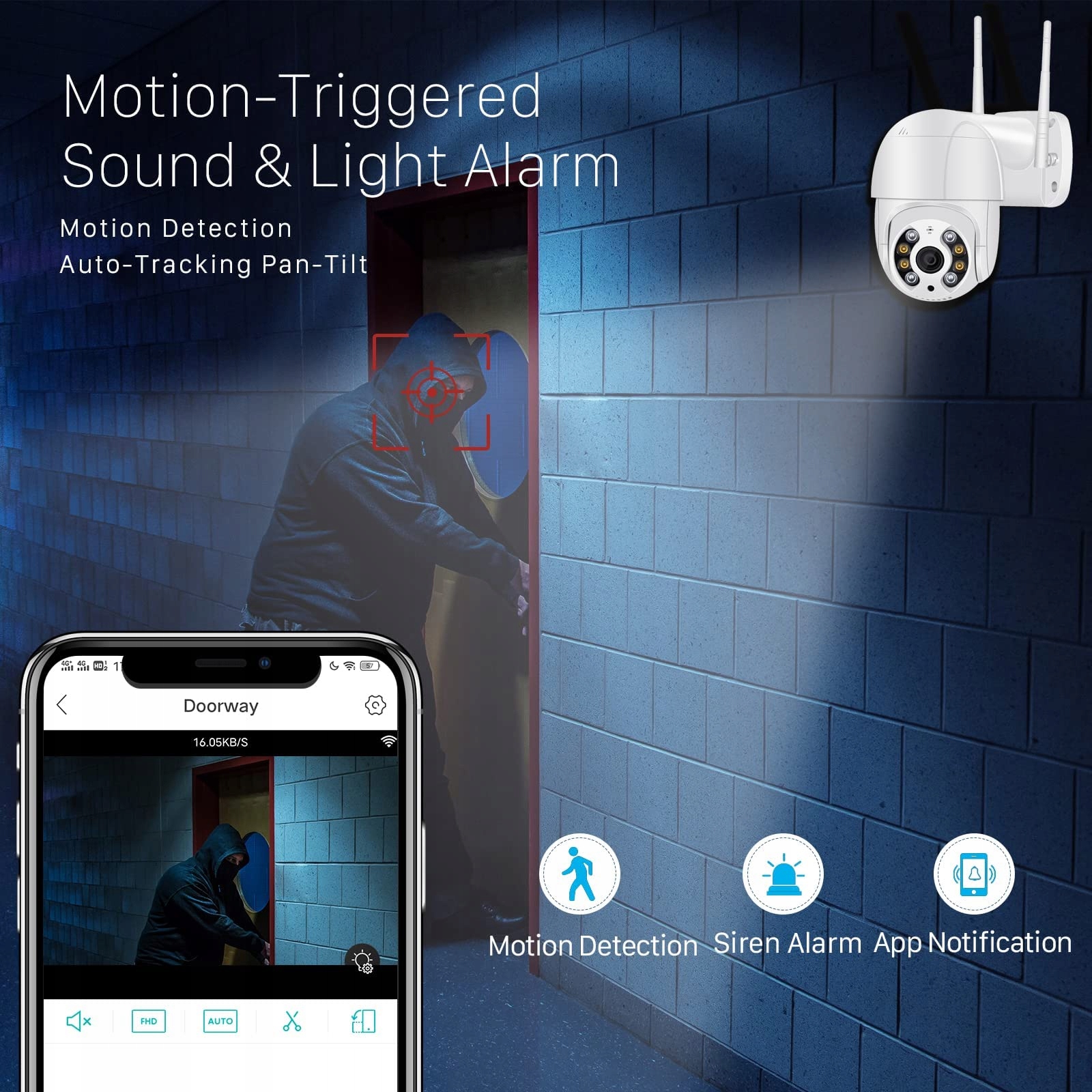 【Podwójna antena 5dBi i automatyczne śledzenie】Kamera monitoringu zewnętrznego WLAN wyposażona jest w dwie ulepszone anteny 5dBi, które skutecznie poprawiają stabilność połączenia WiFi (obsługuje tylko 2,4 GHz). Dzięki naszej dedykowanej aplikacji ''iCSee'' ta kamera monitoringu zewnętrznego obsługuje automatyczne śledzenie poziome, które dokładnie rejestruje każdy ruch. Możesz włączyć lub wyłączyć funkcję automatycznego śledzenia.