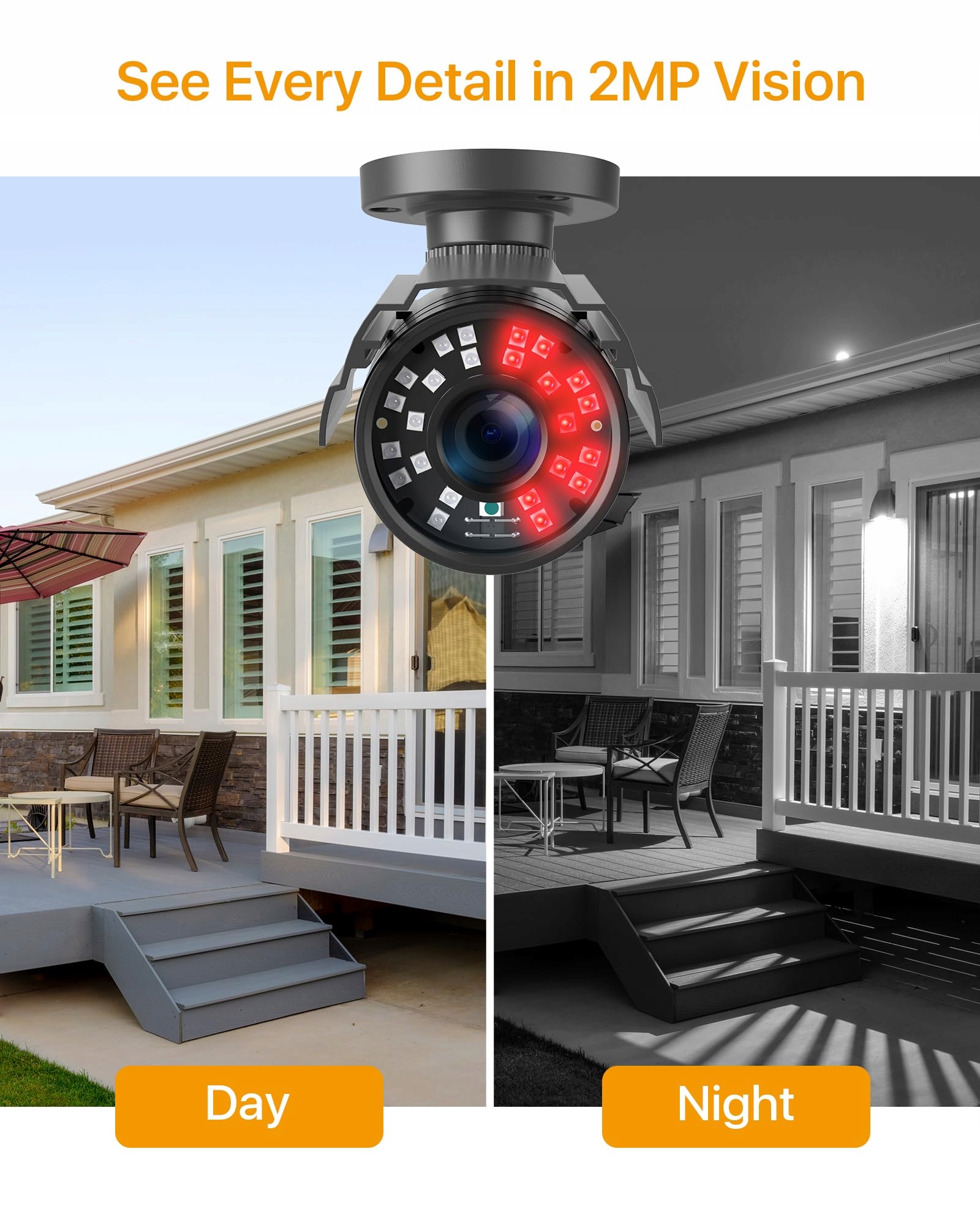 【24 metry widzenia w podczerwieni】24 wbudowane diody IR z filtrem IR Cut zapewniają oświetlenie IR na 24 metry, aby dostarczyć wyraźne obrazy w ciemności w czerni i bieli. Możesz wiedzieć, co się działo w nocy.