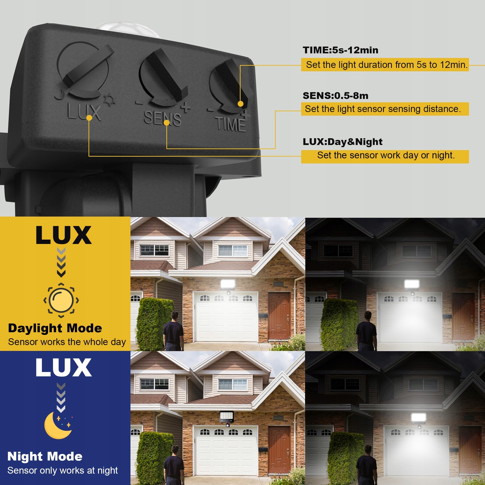 Wbudowany czujnik ruchu: tryby TIME, SENS, LUX do indywidualnych ustawień. Możesz wygodnie ustawić czas świecenia (5s-12min), zasięg wykrywania (0,5-8m) oraz czułość (dzień i noc). Ten led reflektor zewnętrzny z czujnikiem ruchu wykrywa obszar od 0,5 do 8 m z kątem czujnika 180°. Gdy osoba lub pojazd wejdzie w obszar wykrywania, reflektor z czujnikiem ruchu automatycznie się włącza, a następnie wyłącza.