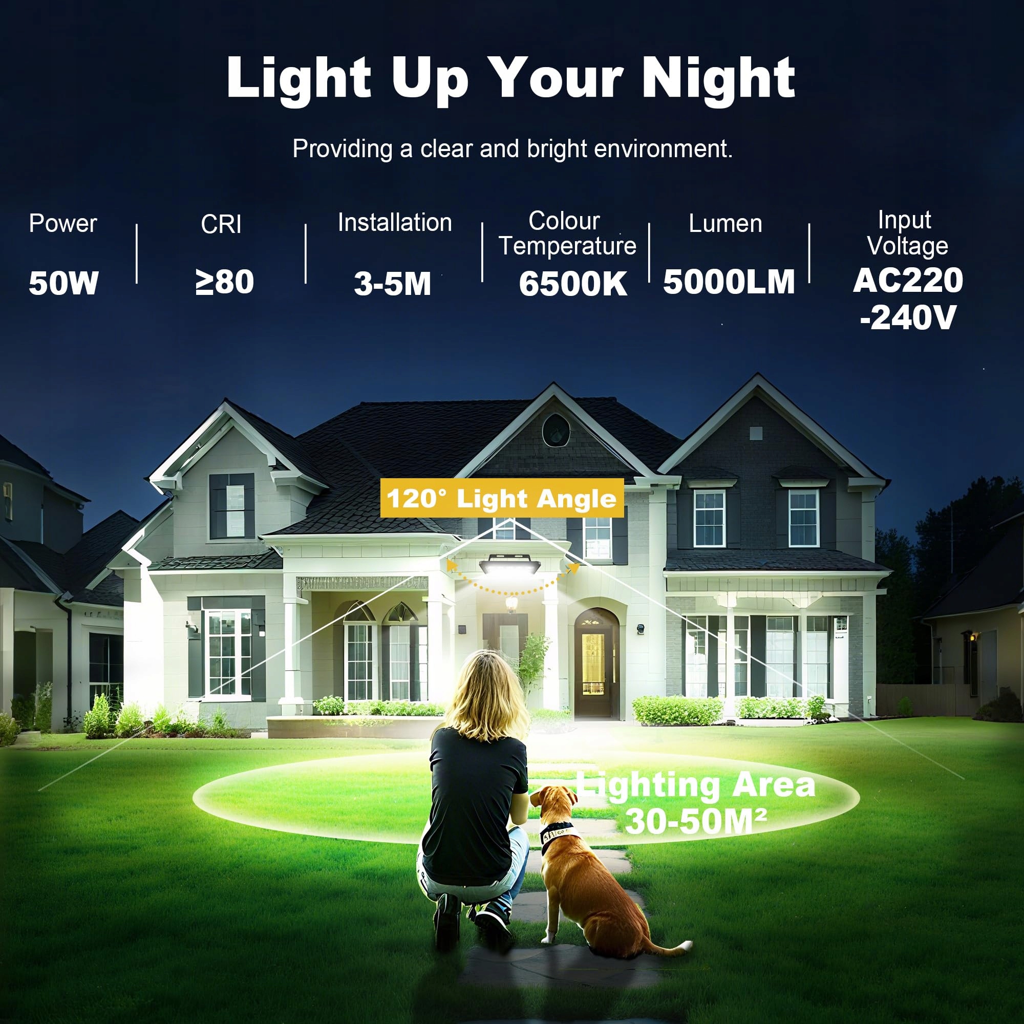 Superjasna lampa zewnętrzna: led reflektor z czujnikiem ruchu z wbudowanymi 60 superjasnymi diodami LED. Ten 50W led reflektor generuje jasność 5000 lumenów. 6500K zimnobiały led reflektor z czujnikiem ruchu nadaje się nie tylko jako światło garażowe, tarasowe i podwórkowe, ale dzięki funkcji czujnika ruchu może także ostrzegać przed zbliżającymi się obcymi, poprawiając widoczność i bezpieczeństwo na zewnątrz.