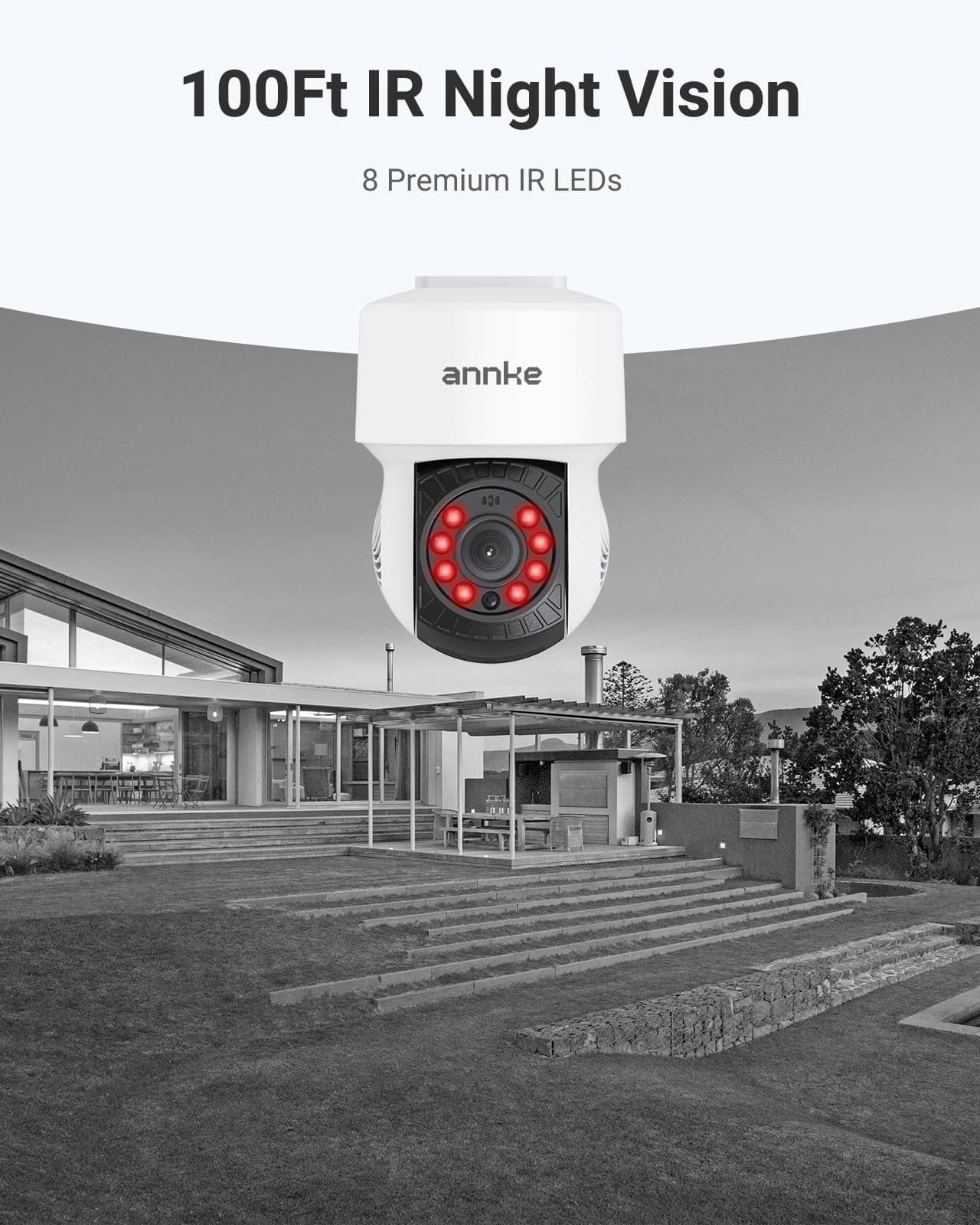 Do 100 stóp czarno-białej noktowizji dla spokoju ducha: 8 zaawansowanych diod LED na podczerwień włącza się automatycznie, zapewniając wyraźny obraz w noktowizji IR. Dzięki tej kamerze monitorującej z orlim okiem noce nie są ani długie, ani ciemne, a widoczna noktowizja gwarantuje maksymalne poczucie bezpieczeństwa.