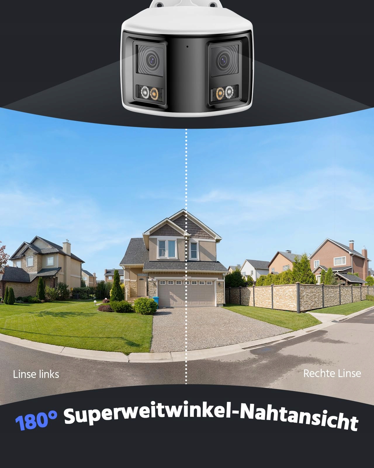 Obraz 4K i ultraszeroki kąt 180°: Dzięki podwójnym obiektywom (2.0mm@F1.6) kamera IP dostarcza ostre filmy 4K (4096×1840@20fps). Dzięki łączeniu obrazu w formacie 20:9 bez zniekształceń i martwych stref – szczegóły pozostają wyraźne nawet przy powiększeniu.