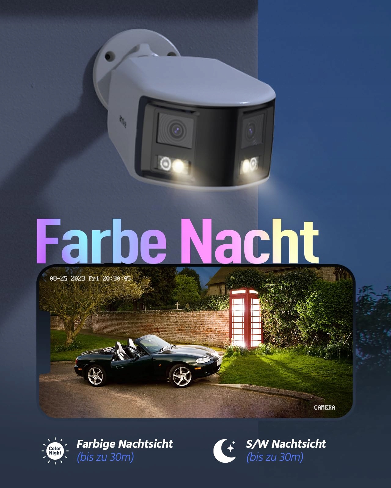 Żywy kolorowy tryb nocny: Kamera oferuje wyraźny obraz kolorowy dzień i noc, aby nie umknął Ci żaden szczegół. Wybierz spośród 3 trybów: kolorowy tryb nocny z reflektorem, kolorowy tryb nocny z białym światłem lub czarno-biały tryb IR. Ustawienia można wygodnie dostosować w przeglądarce.