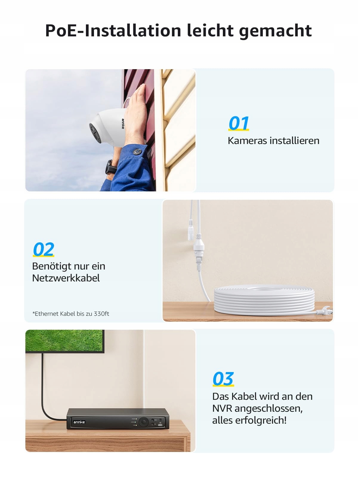 [PoE - prosta instalacja, nawet dla początkujących] Prawdziwy system bezpieczeństwa typu Plug & Play! PoE (zasilanie przez Ethernet) oznacza, że tylko jeden kabel (do 100 metrów) pomiędzy każdą kamerą a NVR odpowiada jednocześnie za zasilanie i przesył sygnału wideo. Proste okablowanie - nie mogłoby być łatwiejsze dla entuzjastów DIY i początkujących.