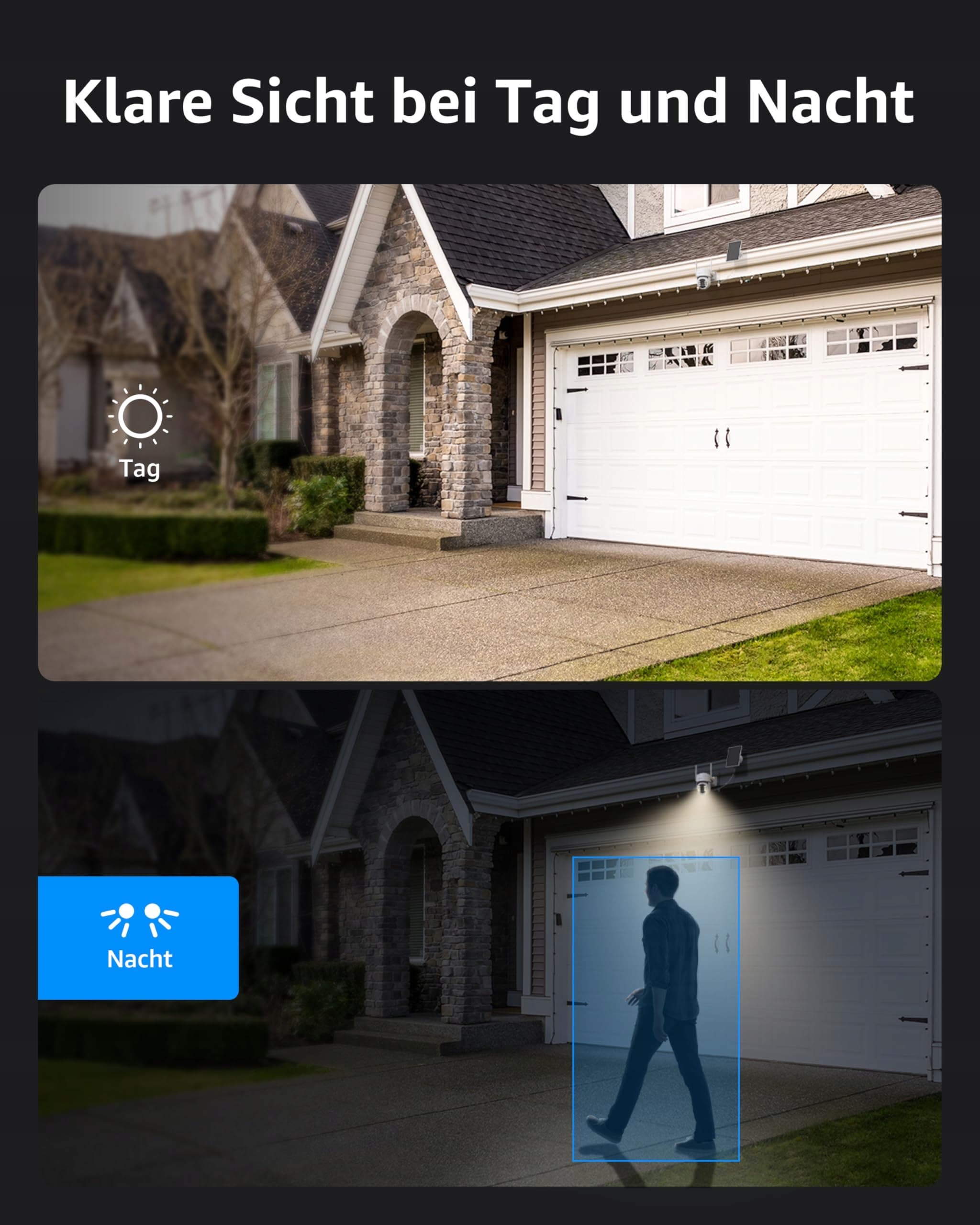 Wykrywanie osób PIR: Kamera do monitoringu na zewnątrz WLAN jest wyposażona w zaawansowaną technologię czujników PIR. Otrzymujesz natychmiastowe i dokładne powiadomienia, gdy wykryte zostaną osoby, a fałszywe alarmy wywołane przez zwierzęta domowe, owady itp. są zredukowane. Kamera WiFi obsługuje niestandardowe obszary monitoringu w celu ochrony Twojej prywatności.