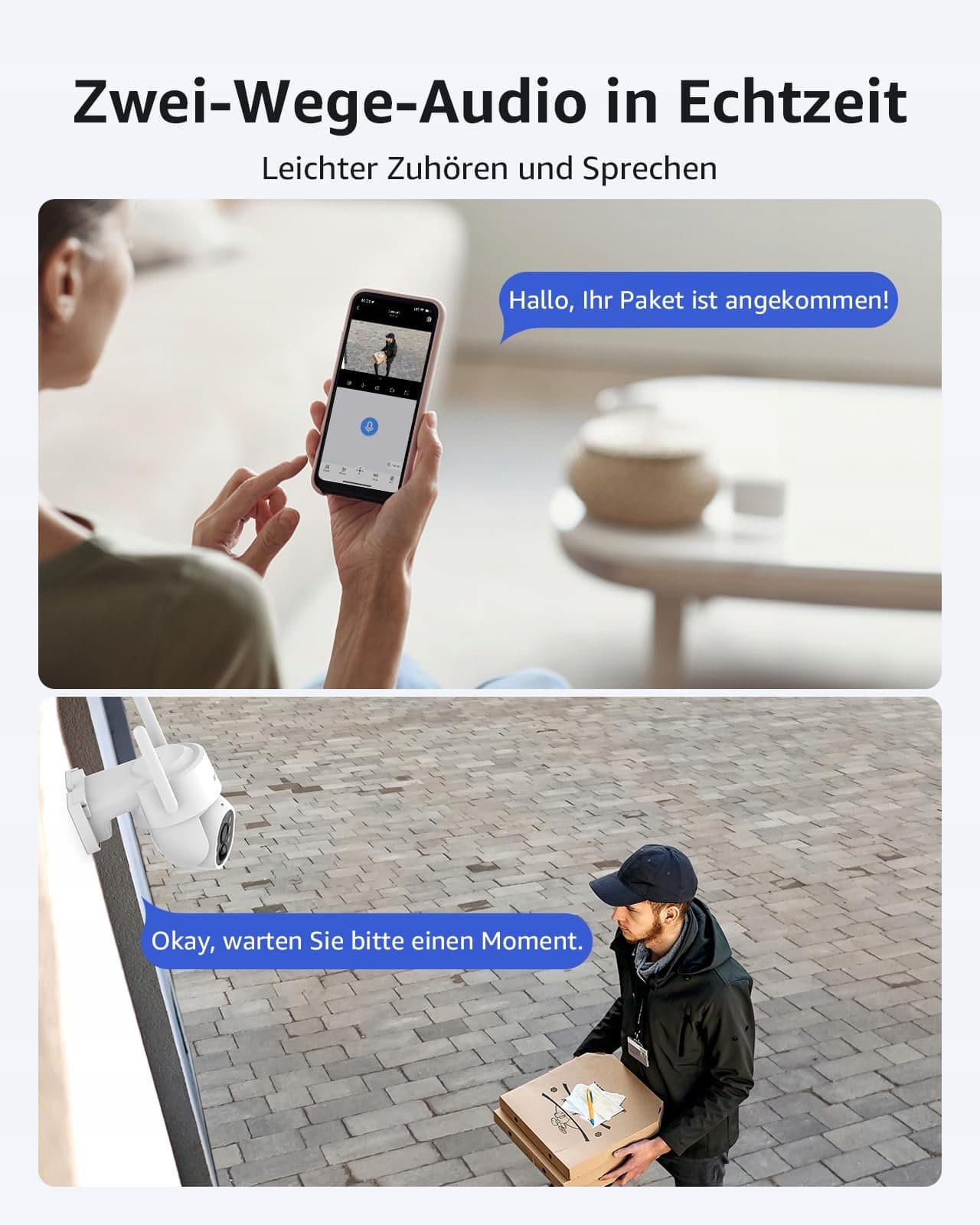 Dwukierunkowe audio: Prosta komunikacja za pomocą bezprzewodowej kamery do monitoringu na zewnątrz, wbudowany głośnik i mikrofon. Przywitaj gości, wydaj instrukcje lub rozmawiaj z dostawcami – wszystko bezpośrednio przez aplikację kamery! Dzięki naszej przyjaznej aplikacji na smartfony możesz oglądać materiały z monitoringu z dowolnego miejsca. Chroń swoje bezpieczeństwo.