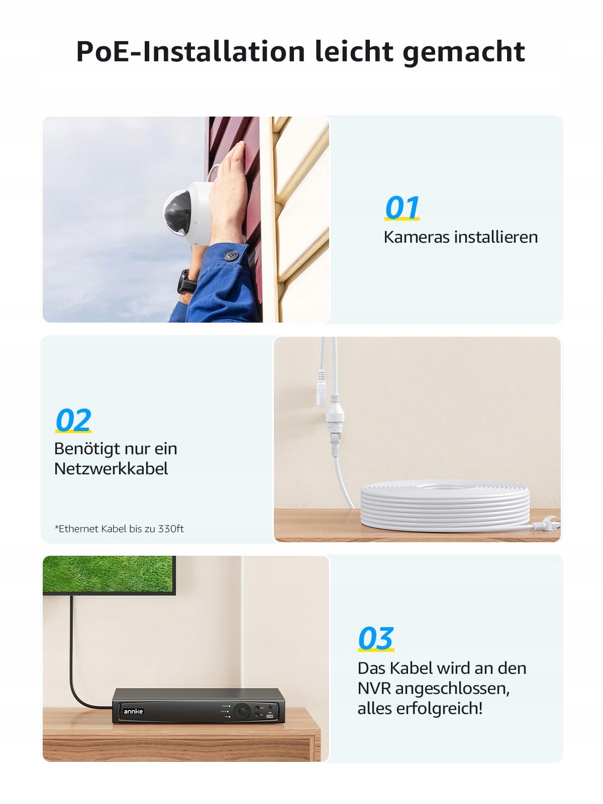 PoE – łatwa instalacja, nawet dla początkujących: Prawdziwy system bezpieczeństwa Plug & Play! PoE (zasilanie przez Ethernet) oznacza, że tylko jeden kabel (do 100 metrów) między kamerą a rejestratorem NVR odpowiada jednocześnie za zasilanie i przesył sygnału wideo. Proste okablowanie – nie mogłoby być łatwiejsze dla entuzjastów DIY i początkujących.