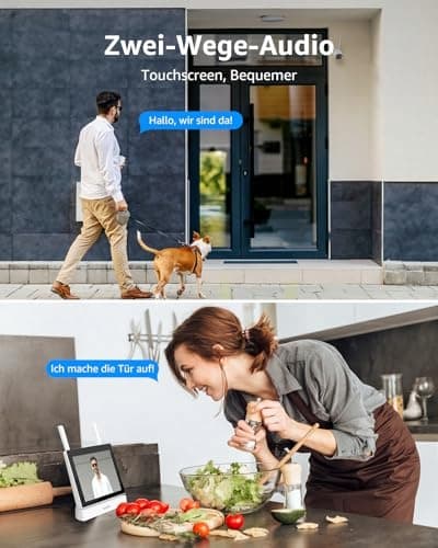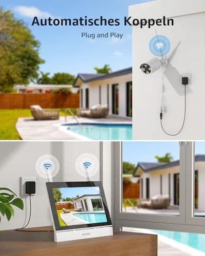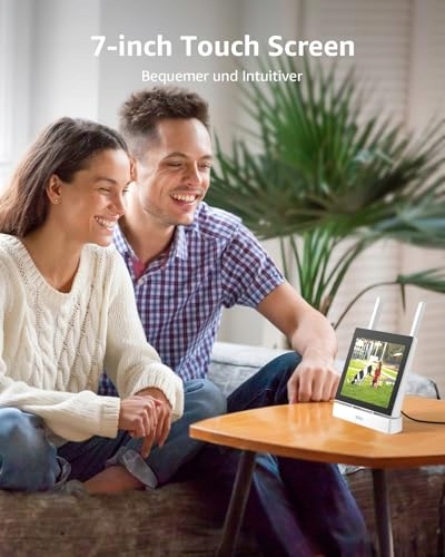 Ekran dotykowy 7 cali: Bezprzewodowy zestaw kamer monitoringu jest wyposażony w 7-calowy ekran dotykowy, wyświetlający obraz monitoringu w czasie rzeczywistym, wystarczy przesunąć palcem, aby łatwo obsługiwać. NVR i kamery WiFi mogą być automatycznie sparowane i połączone po włączeniu, bez potrzeby sieci, można również używać, prawdziwe Plug and Play.