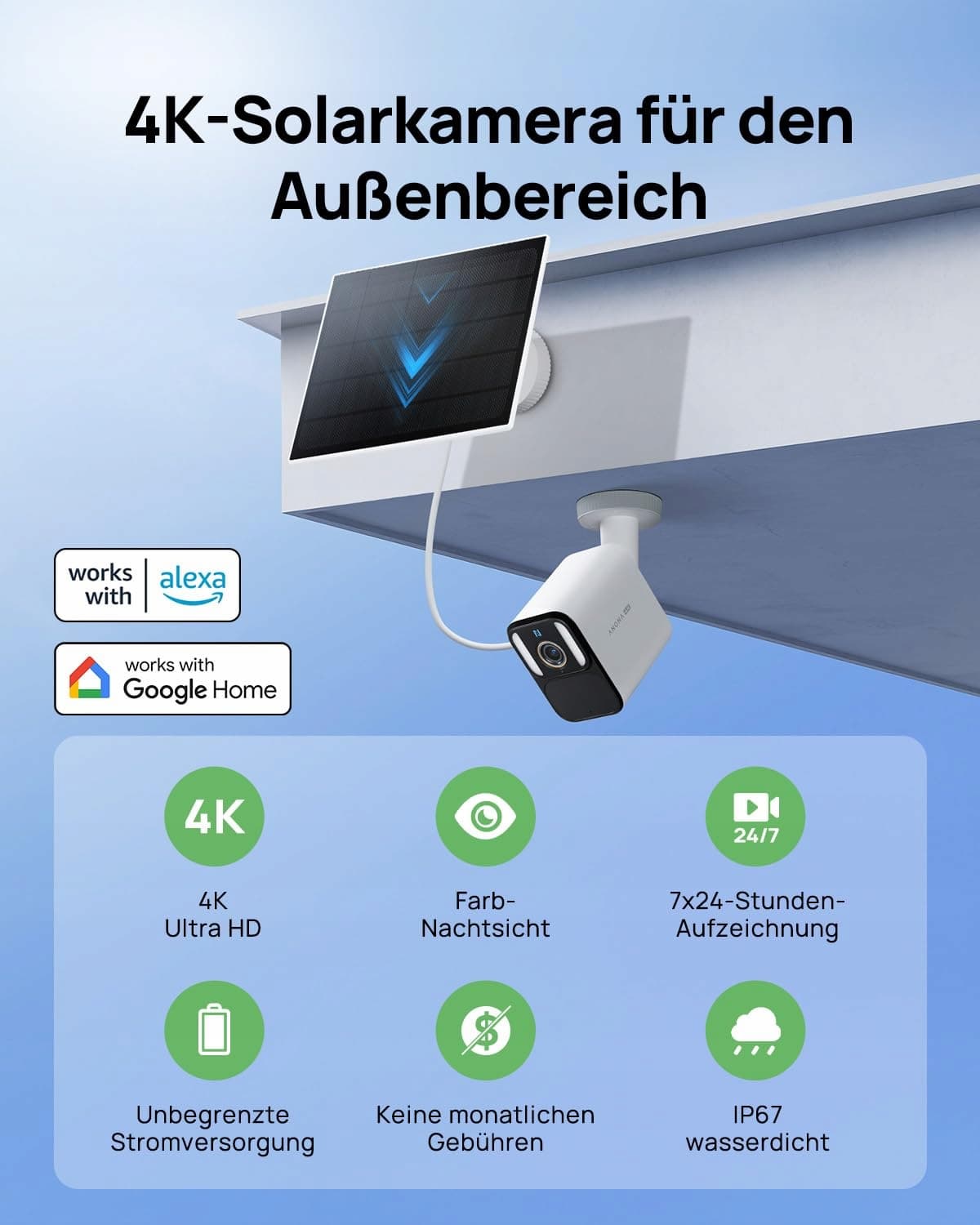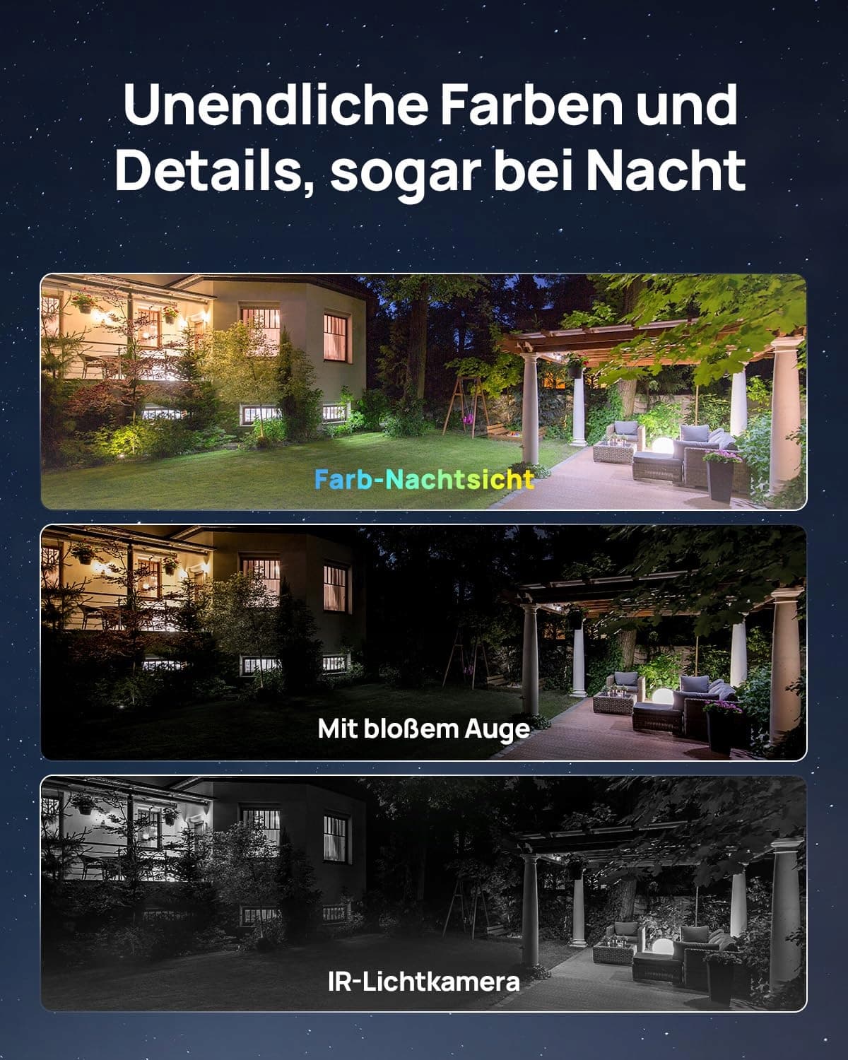 【4K-UHD widok i kolorowy tryb nocny】Bezprzewodowe kamery solarne Aurora do monitoringu na zewnątrz rejestrują każdy szczegół z oszałamiającą rozdzielczością 4K i 8 megapikseli, oferując krystalicznie czysty obraz i niezawodne bezpieczeństwo przez całą dobę. Wyposażona w czujnik Starlight i dużą przysłonę F1,2, Aurora zapewnia żywy kolorowy tryb nocny nawet przy słabym oświetleniu.