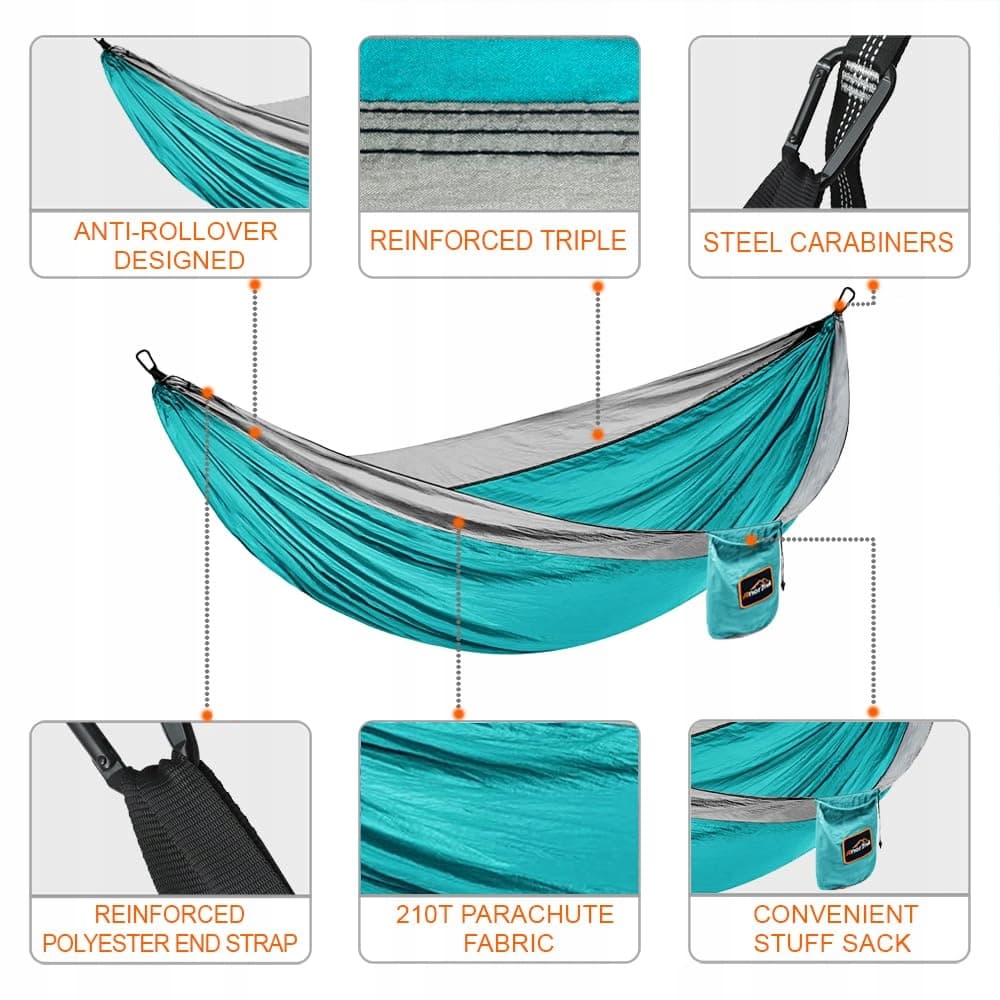 Wytrzymały materiał: Campingowy hamak wykonany jest z trwałego, oddychającego nylonu 210T i wyposażony w dwa 2,5-metrowe paski do drzew oraz karabinki, co sprawia, że instalacja jest dziecinnie prosta. Posiada również 5 oddzielnych pętli do łatwej regulacji wysokości i komfortu, co również pomaga chronić drzewa podczas relaksu na łonie natury.