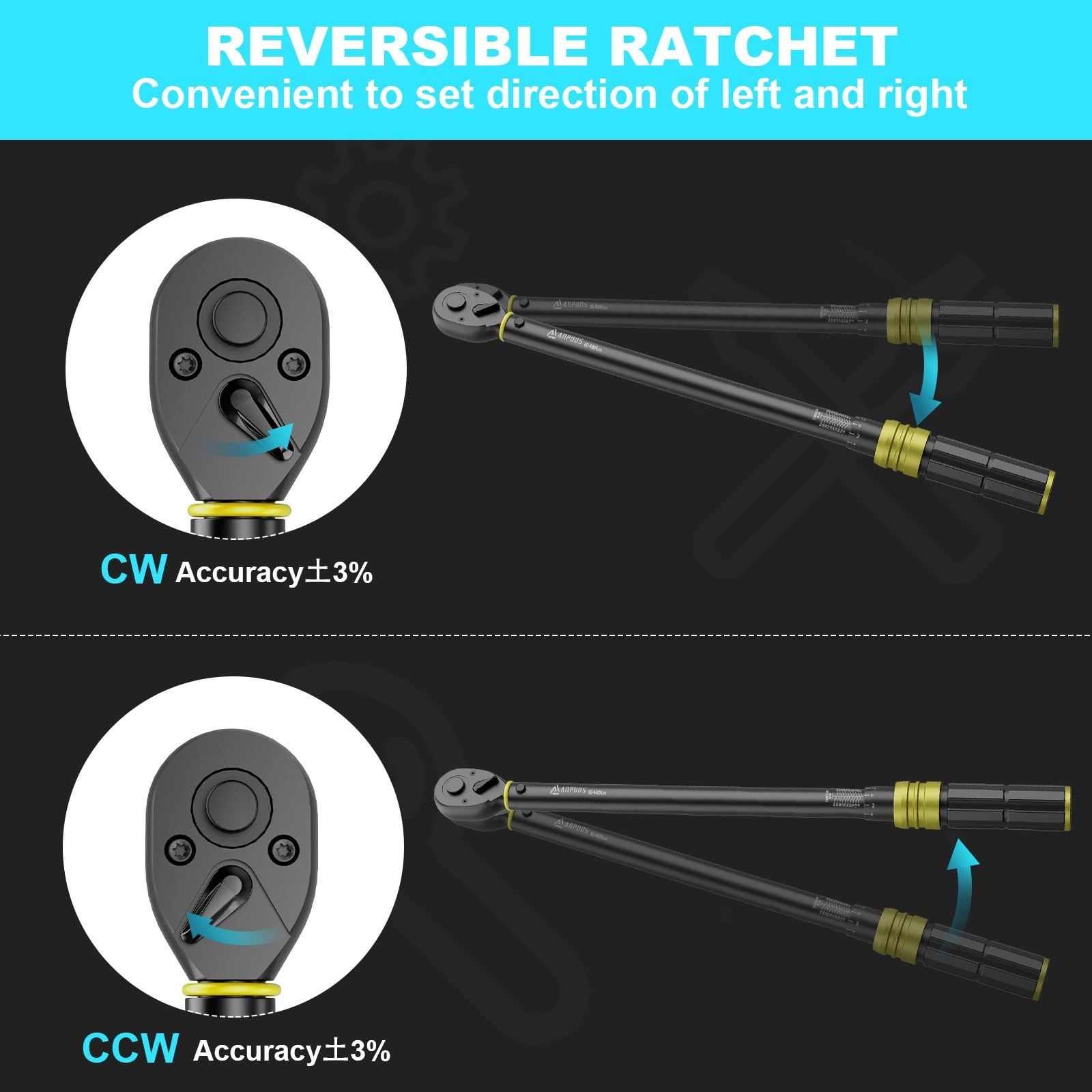 【Dwa kierunki z 72 zębami】 Klucz dynamometryczny ma odwracalną głowicę zapadkową z 72 zębami i szybkozłączem, co ułatwia instalację i demontaż nasadki oraz mocno ją trzyma, aby zapobiec upadkowi. Płetwa głowicy klucza dynamometrycznego może dostosować kierunek użycia w każdej chwili, może być używana zarówno w kierunku zgodnym, jak i przeciwnym do ruchu wskazówek zegara.
