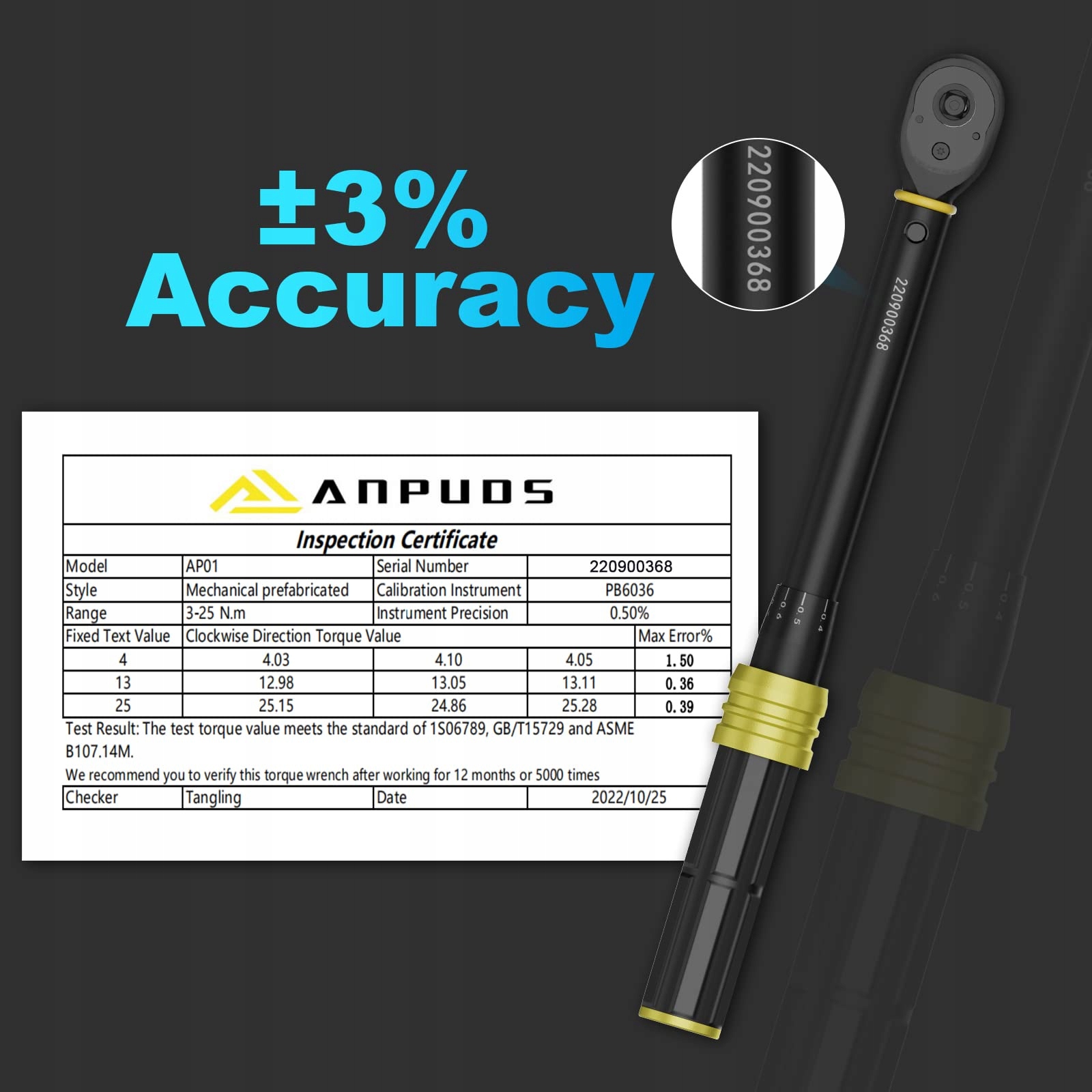 【±3% dokładność】 Klucz dynamometryczny 1/4' z formalnym certyfikatem kalibracji zgodnym z ISO 6789, GB/T15729 i ASME B107.14M. Błąd dokładności w granicach ±3%. Głowica zapadkowa z 72 zębami obraca się tylko o 5 stopni, aby poprawić dokładność. Ważne: Przy niskich ustawieniach Nm poniżej 5 Nm kliknięcie może być 'subtelne'. Pomiędzy 5 a 25 Nm kliknięcie będzie silniejsze.