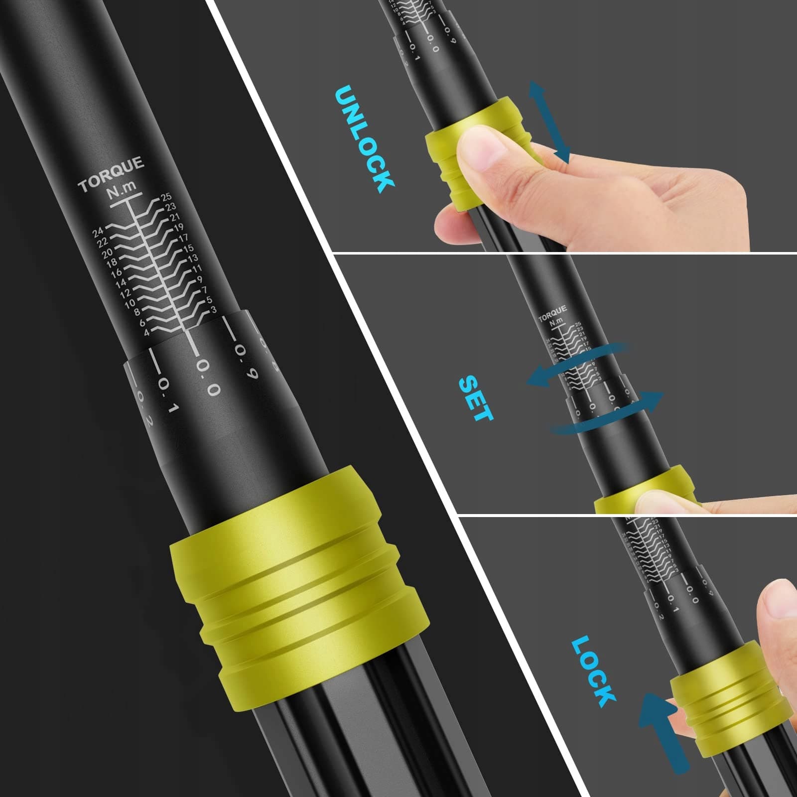 【Łatwy w użyciu i odczycie】 Funkcja z pierścieniem regulacyjnym umożliwiająca szybkie i łatwe ustawienie momentu obrotowego. Czarna elektrogalwanizowana powierzchnia klucza dynamometrycznego do motocykli, wyróżniająca się białą skalą. Łatwy do odczytania i identyfikacji oznaczeń nawet w słabych warunkach oświetleniowych.