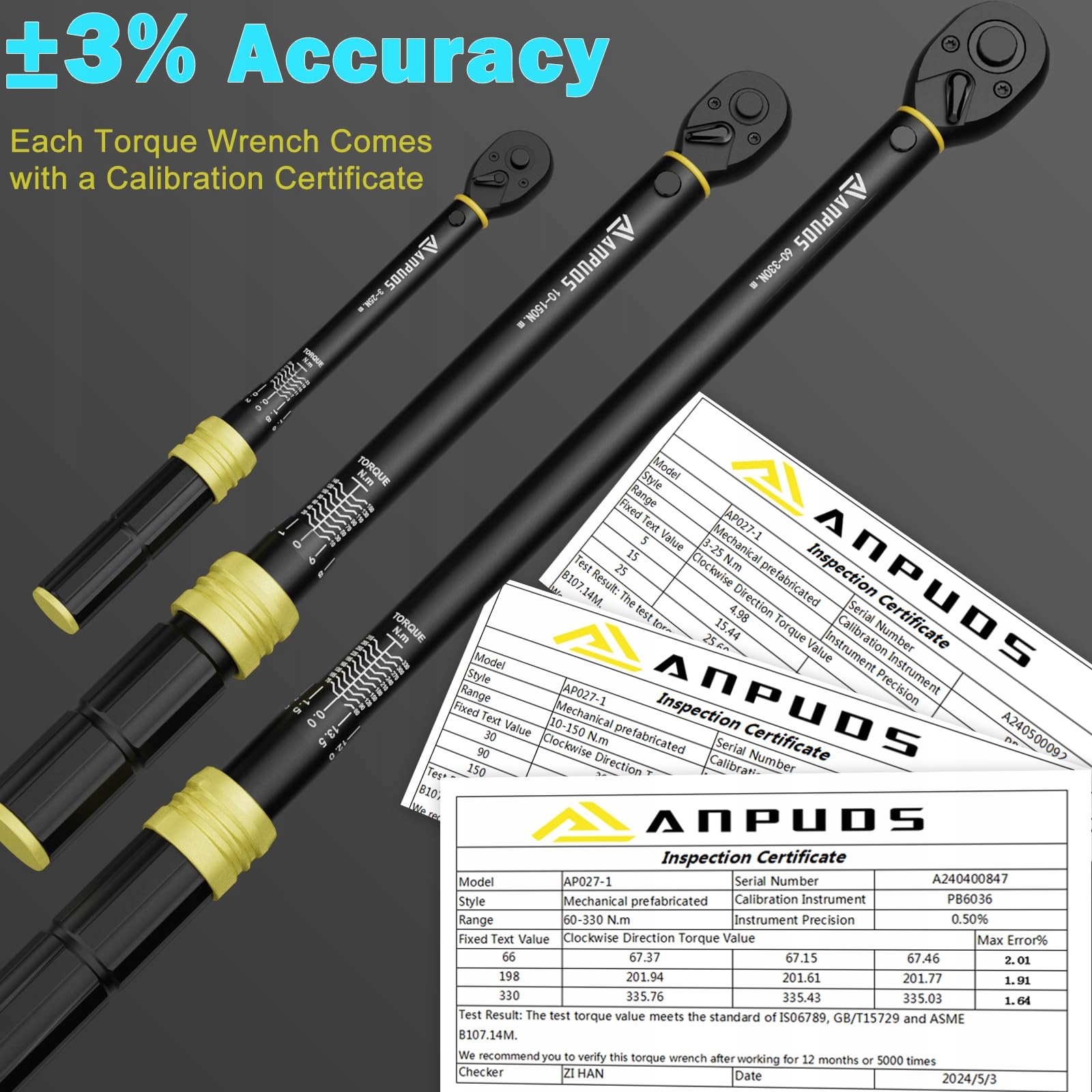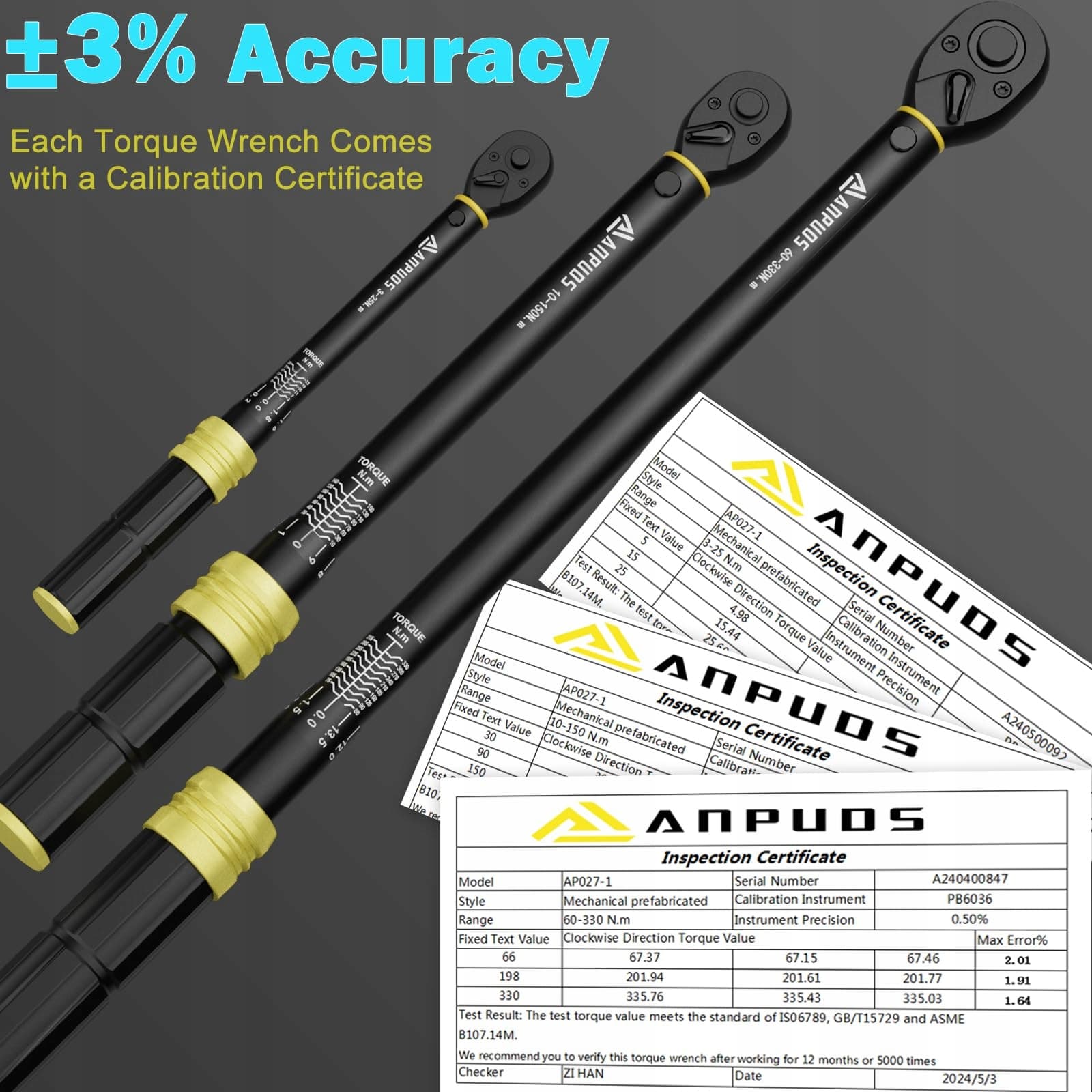 【5-częściowy przydatny zestaw kluczy dynamometrycznych】Ten zestaw kluczy dynamometrycznych z napędem 1/4: 3-25 Nm, napędem 3/8: 10-150 Nm, napędem 1/2: 60-330 Nm. Każdy klucz dynamometryczny jest wstępnie kalibrowany przed wysyłką zgodnie z wymaganiami ISO 6789, GB/T15729 i ASME B107.14M. Dokładność jest testowana w granicach ±3% zgodnie z normami przemysłowymi.
