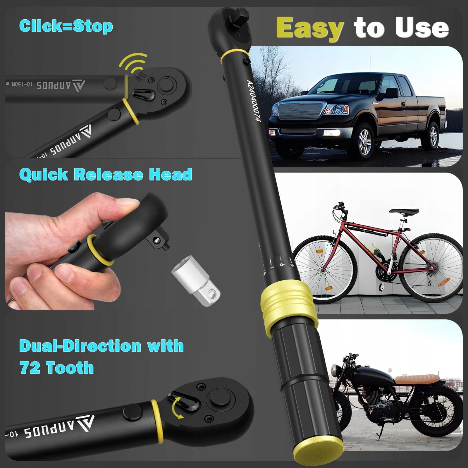 【Dwukierunkowy z 72 zębami】Klucz dynamometryczny ma przycisk szybkiego zwolnienia z 72 zębami, co ułatwia instalację i demontaż gniazda oraz mocno trzyma gniazdo, aby zapobiec jego upadkowi. Dźwignia głowicy klucza dynamometrycznego może dostosować kierunek użycia w każdej chwili, może być używana w obu kierunkach, zgodnie z ruchem wskazówek zegara i przeciwnie do ruchu wskazówek zegara.